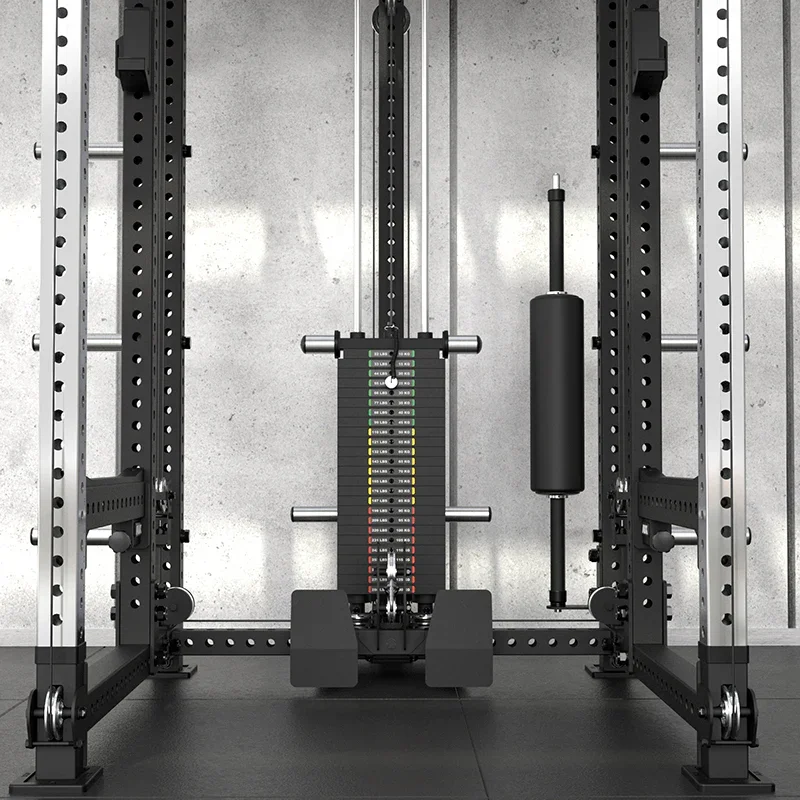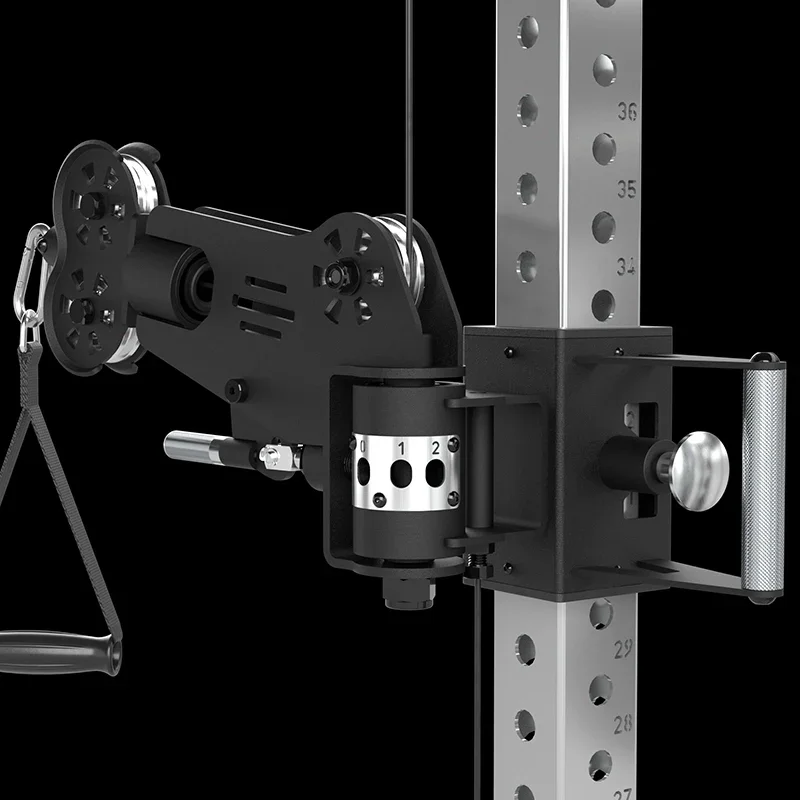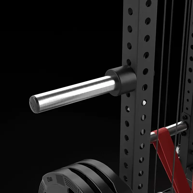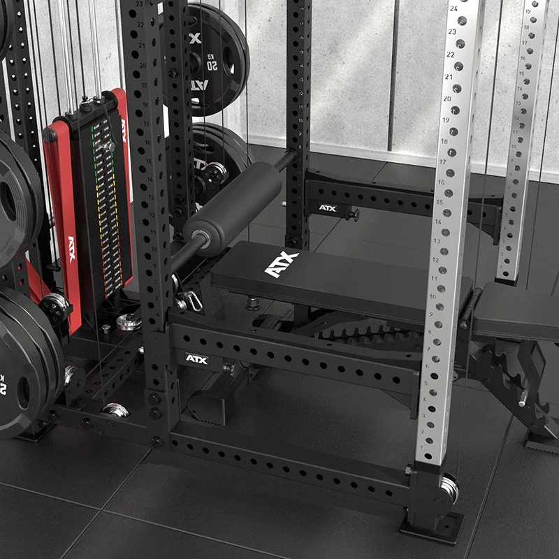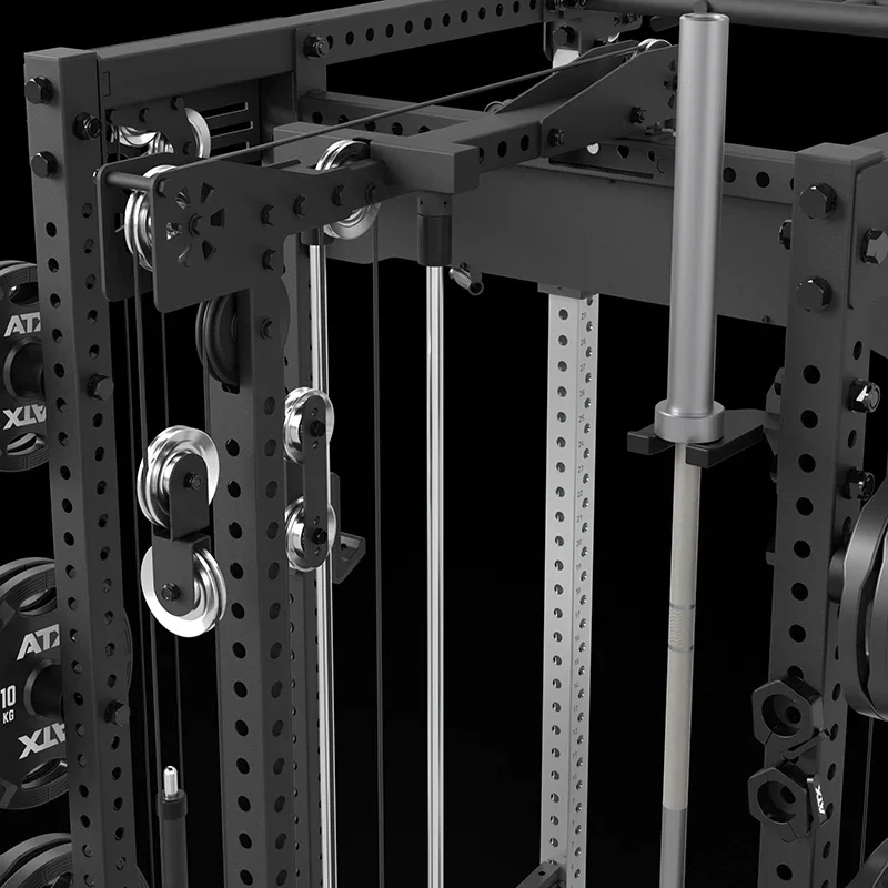 Die integrierte Multi-Latzugstation arbeitet mit 125 kg Steckgewichten und einer 1:1 Übersetzung für direkte Kraftübertragung. Eine zusätzliche Dual-Cable-Cross-Station ist individuell höhenverstellbar (1:2 Übersetzung) und schwenkbar – ideal für funktionelles Training und breite Zugweiten. J-Hooks, Heavy-Duty Flip-Down-Spotter, Multigrip-Klimmzugstange sowie ein 8-faches Hantelscheiben-Storage sind bereits enthalten.