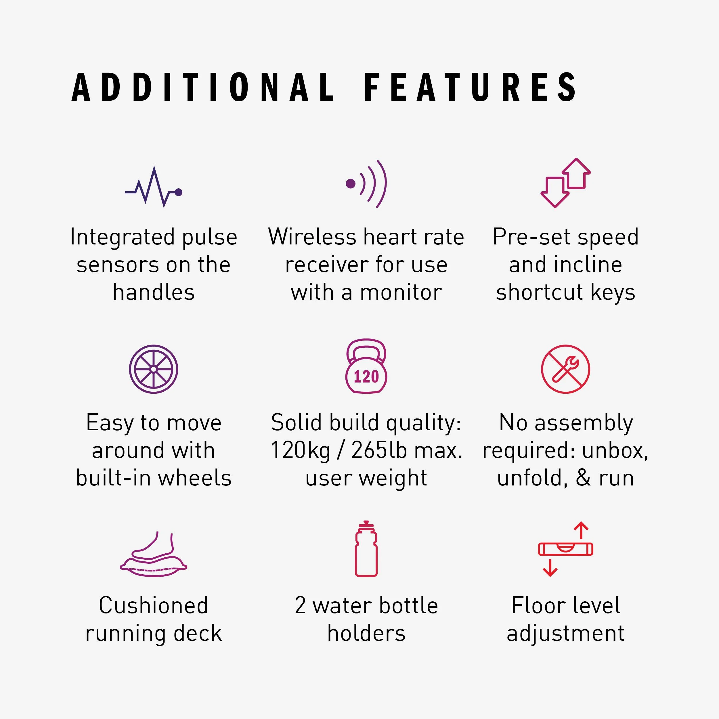 Das Gerät ist zwift- und kinomap-kompatibel und lässt sich mit der adidas Console+ App verbinden. Ein kabelloser Bluetooth 4.0 Herzfrequenz-Empfänger, integrierter Handpuls, Drehreglersteuerung und Schnellwahltasten sorgen für präzise Trainingskontrolle. Die großzügige Lauffläche mit Dämpfung entlastet Knie und Sprunggelenke. Kein Werkzeug, keine Montage – einfach aufklappen und starten.