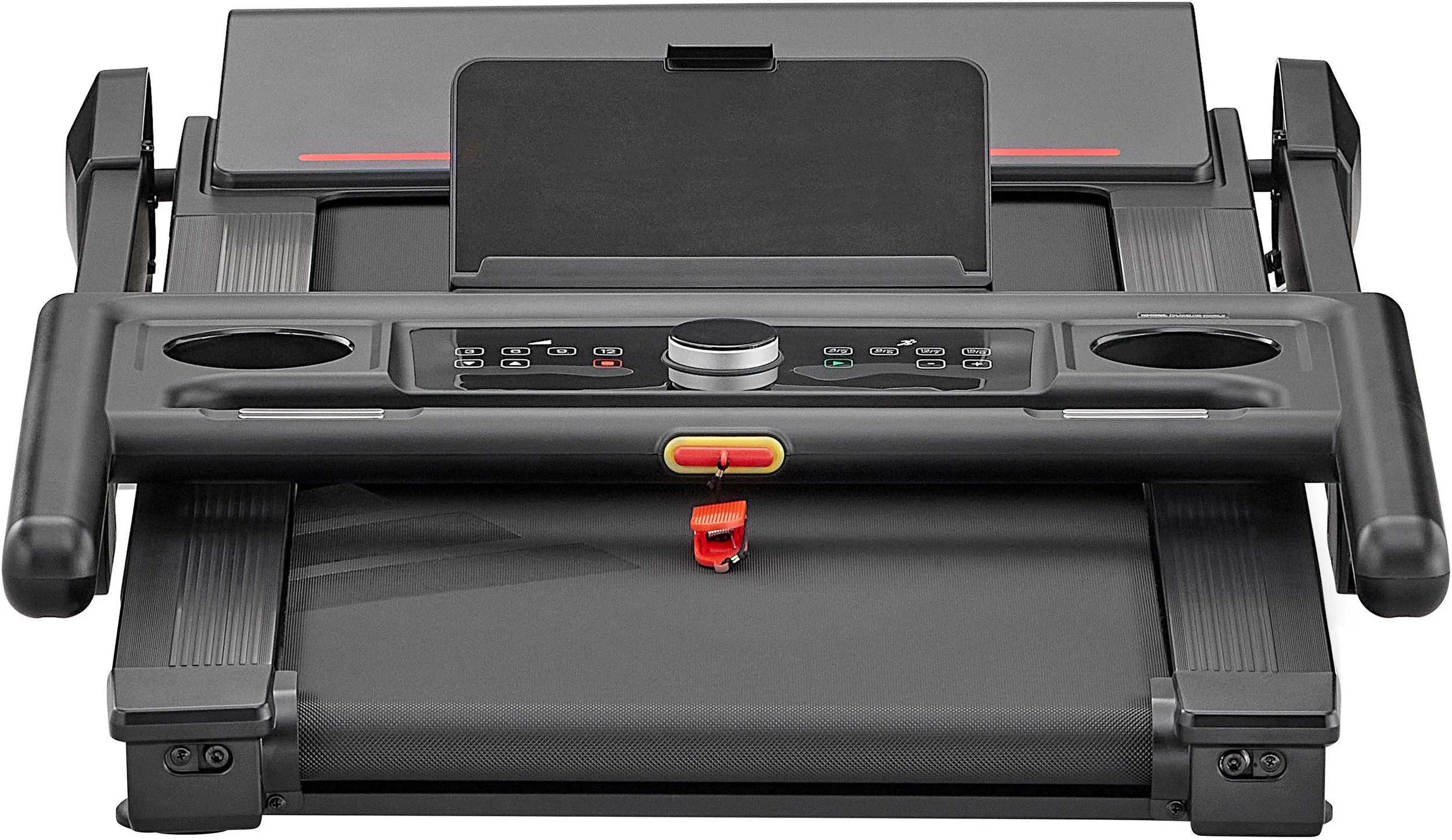 Das T-1 kombiniert moderne Trainingsfunktionen mit einem kompakten, vollständig klappbaren Rahmen. Der bürstenlose 2-PS Motor ermöglicht Geschwindigkeiten bis 15 km/h und 12 Steigungsstufen für abwechslungsreiches Ausdauer- und Intervalltraining zu Hause.