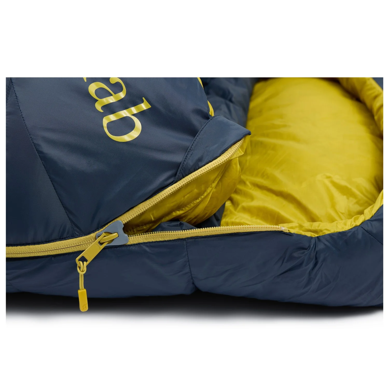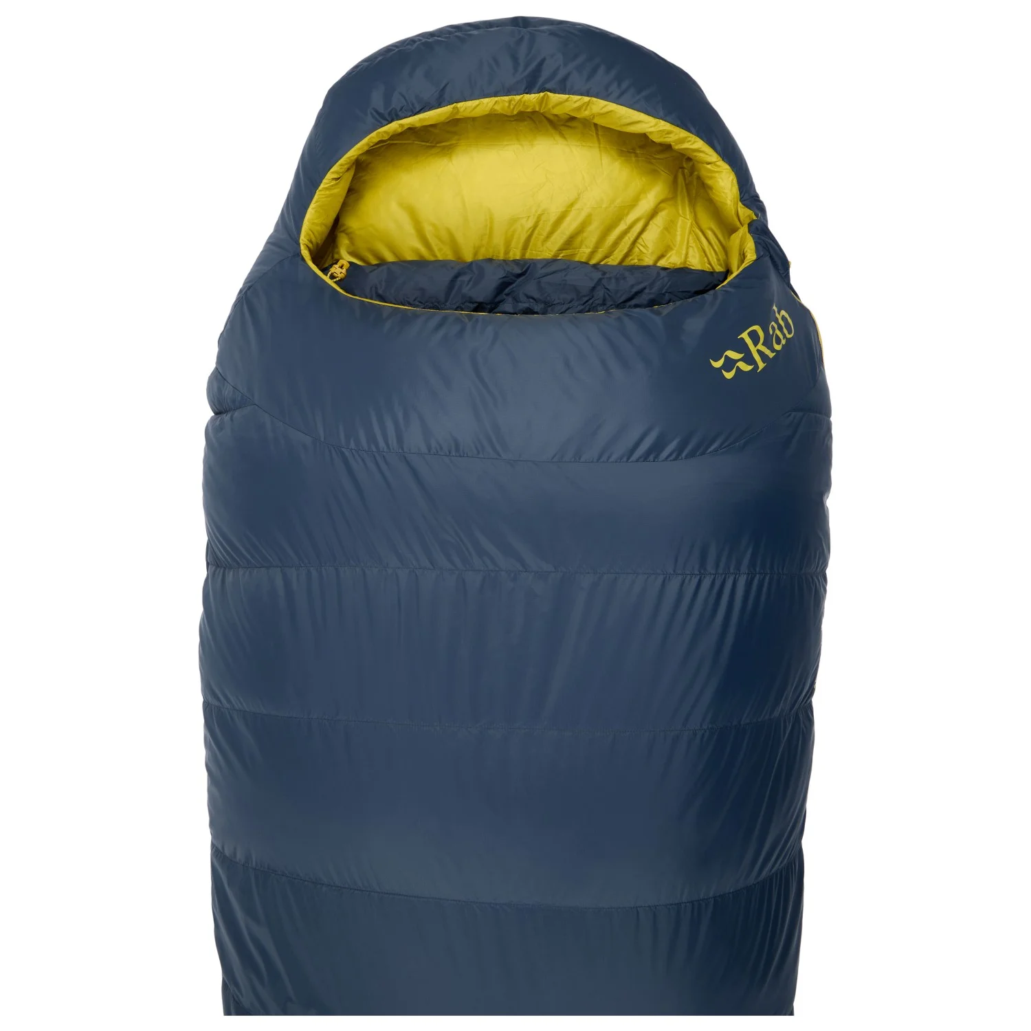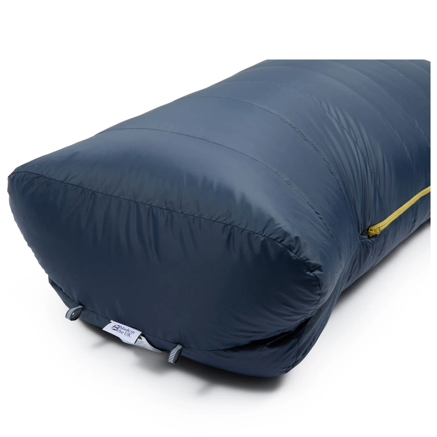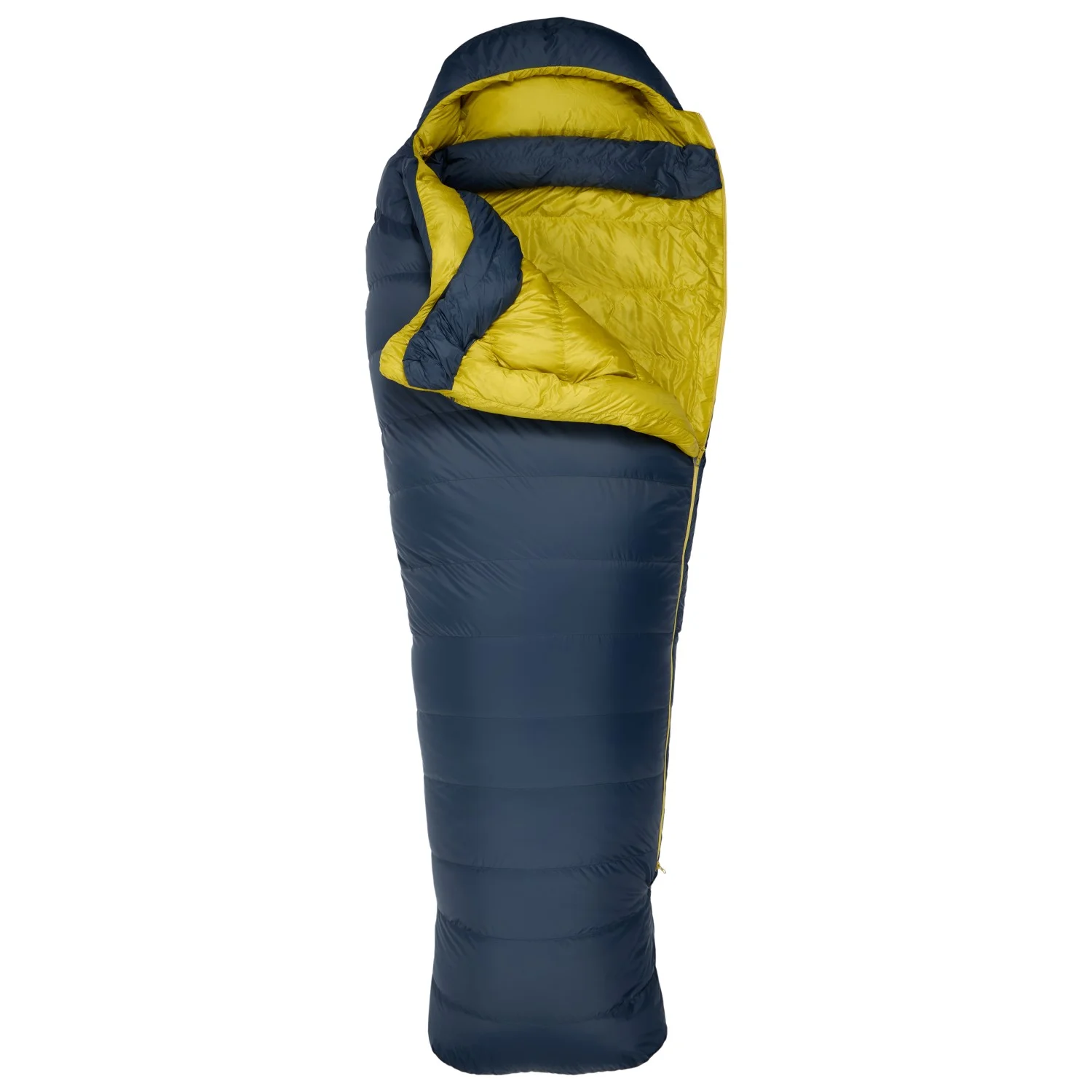 Das robuste Pertex®-Quantum-Pro-Außenmaterial schützt dank DWR-Imprägnierung zuverlässig vor Feuchtigkeit. Die hochwertige Entendaunenfüllung bietet angenehmen Loft und lässt sich gut komprimieren. Trapezförmige Kammern reduzieren Kältebrücken, während Wärmekragen, 3D-Kapuze und ergonomische Fußbox die Wärme effektiv im Schlafsack halten.