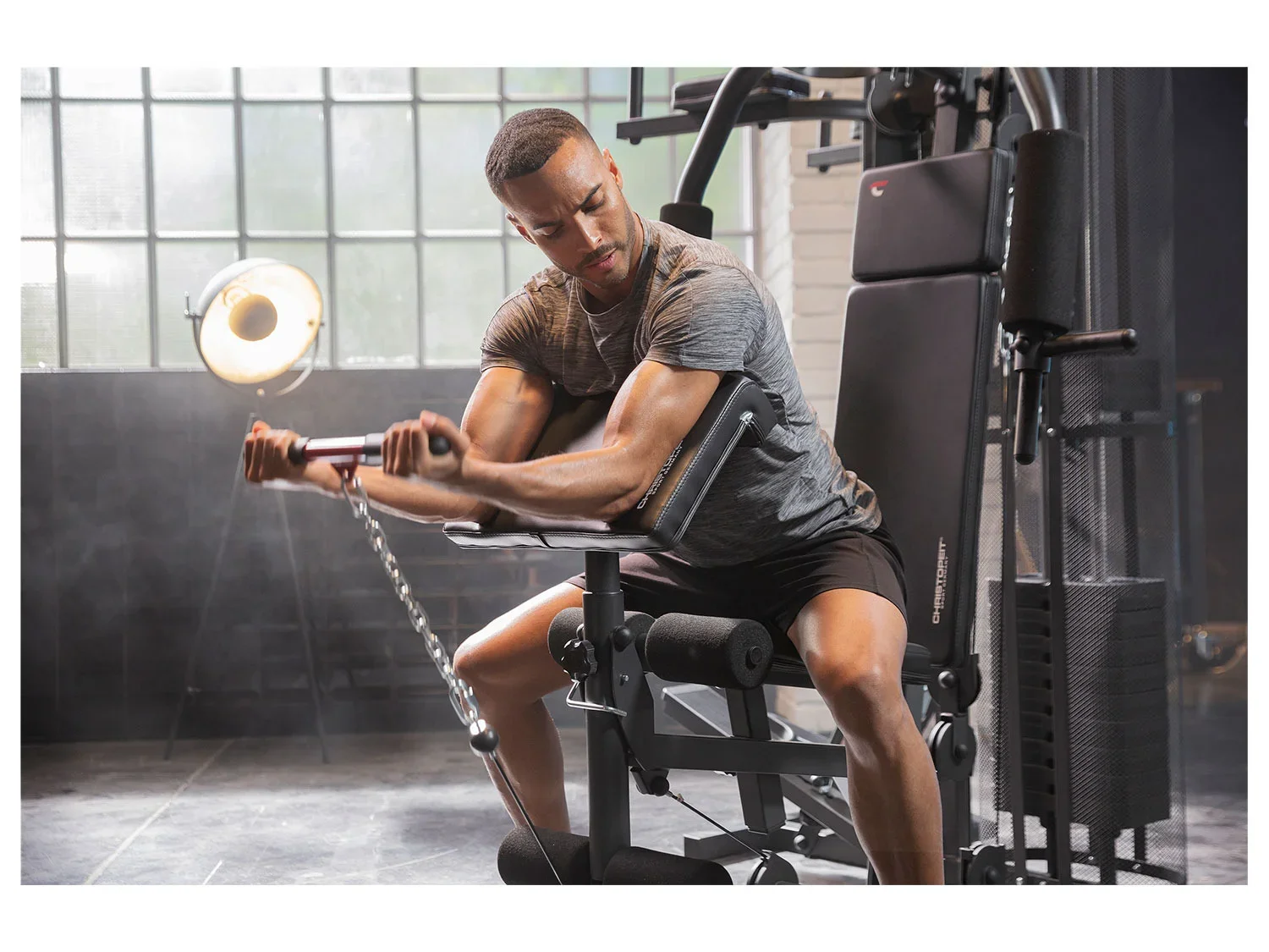 Highlights: 45+ Übungsmöglichkeiten, Redline-Design, ergonomischer Komfortsitz, Lordosestütze, 60 kg Steckgewichte (erweiterbar), Stepper-Modul, Seilzug unten, Curlpult, Beinstrecker & -beuger, Latissimus-Training, Butterfly/Brustpresse.