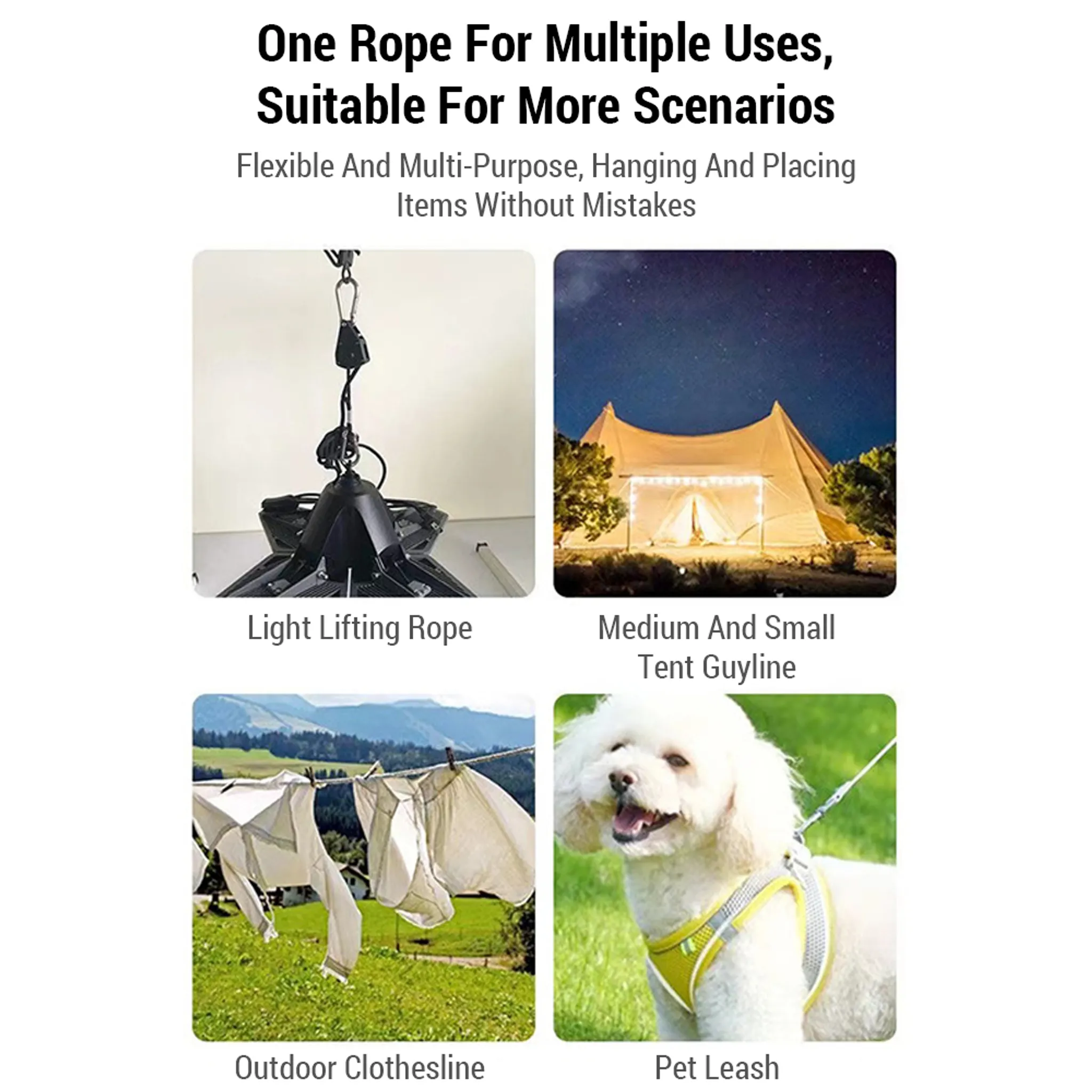 Die verstellbare Camping-Seilschnalle ist ein vielseitiges Hilfsmittel für zahlreiche Outdoor- und Haushaltsanwendungen. Ob zum Abspannen von Zelten, als Wäscheleine, Tragehilfe oder zum Sichern leichter Gegenstände – dieses robuste Seil-Set bietet flexible Einsatzmöglichkeiten mit zuverlässiger Stabilität.