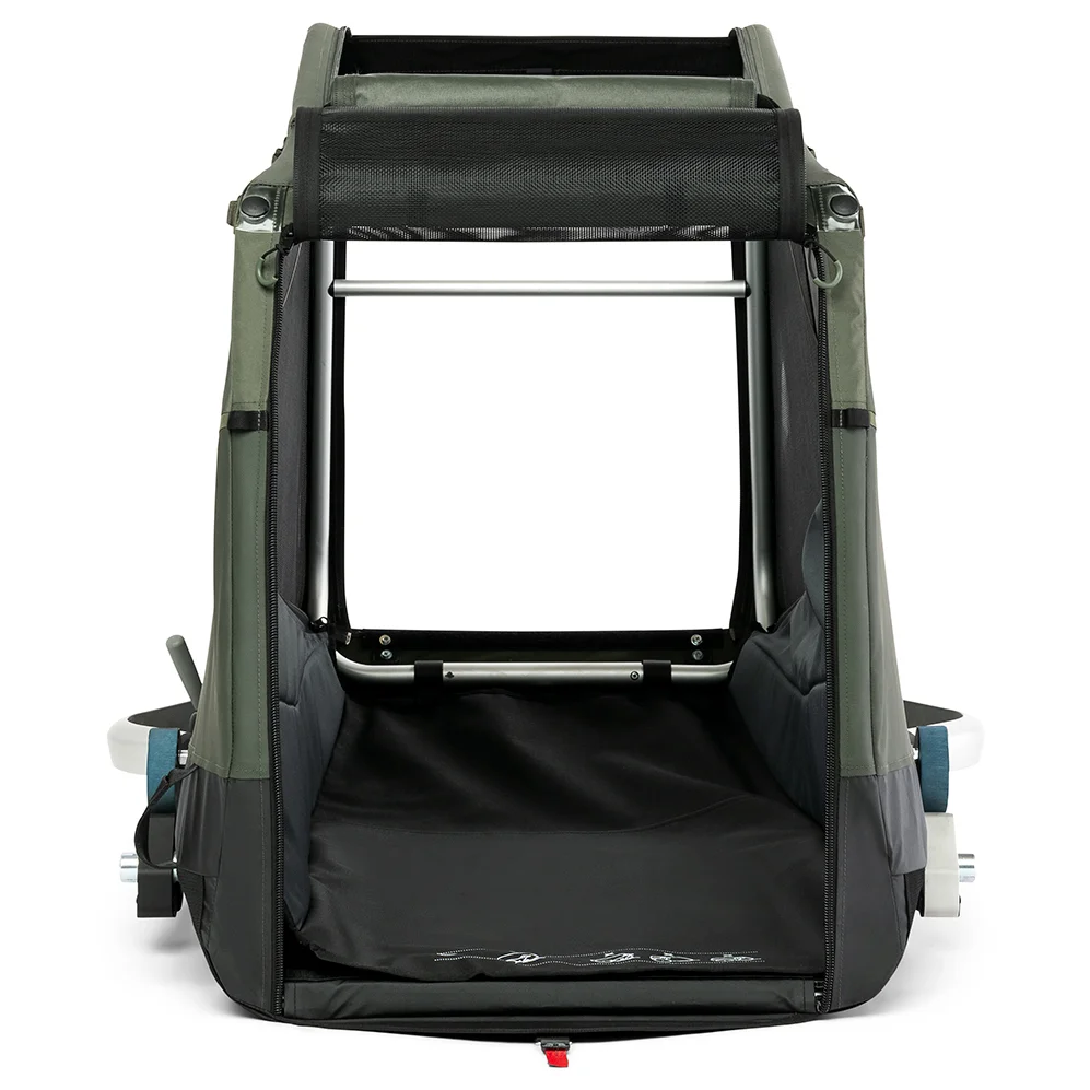 Dein Hund kann bequem sitzend oder liegend mitfahren. Die Cabrio-Öffnungen vorne und oben ermöglichen Frischluft und freie Sicht. Der besonders niedrige Einstieg von nur 21 cm erleichtert auch Welpen, älteren oder eingeschränkten Hunden den Zugang. Für Transport und Lagerung lässt sich der Anhänger mit wenigen Handgriffen platzsparend zusammenfalten.