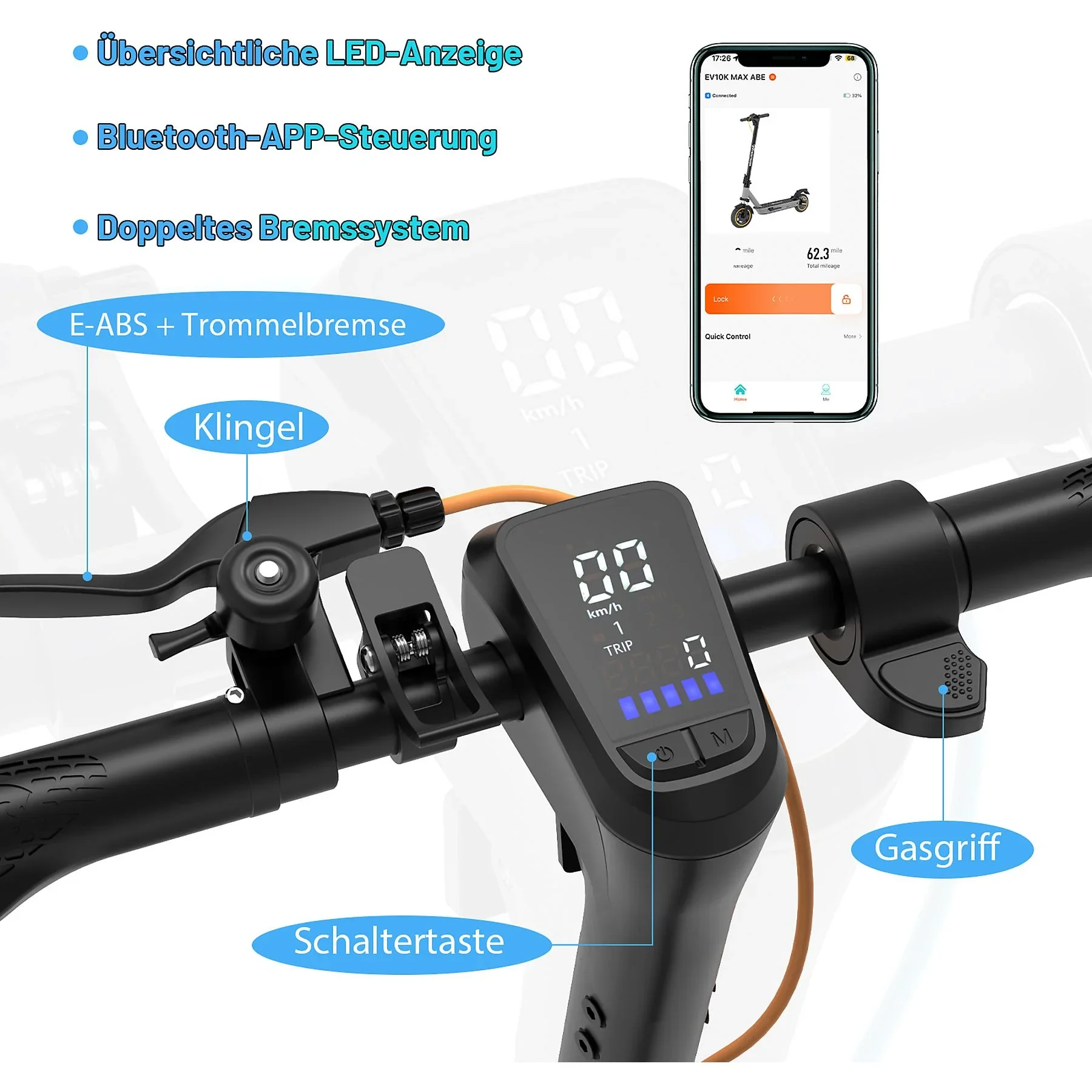 | Im Paket | EV10K MAX ABE E-Scooter, Ladegerät, Bedienungsanleitung, ABE-Datenbestätigung, Werkzeugset |
