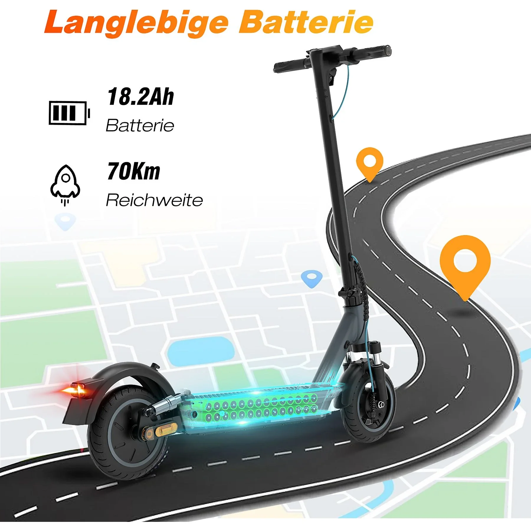 Der bürstenlose Motor mit 400 W sorgt für eine gleichmäßige Beschleunigung bis zur zulässigen Höchstgeschwindigkeit von 20 km/h. In Kombination mit dem leistungsstarken 36 V Akku mit 18,2 Ah sind Reichweiten von bis zu 70 km möglich – ideal für Pendelstrecken und längere Fahrten.