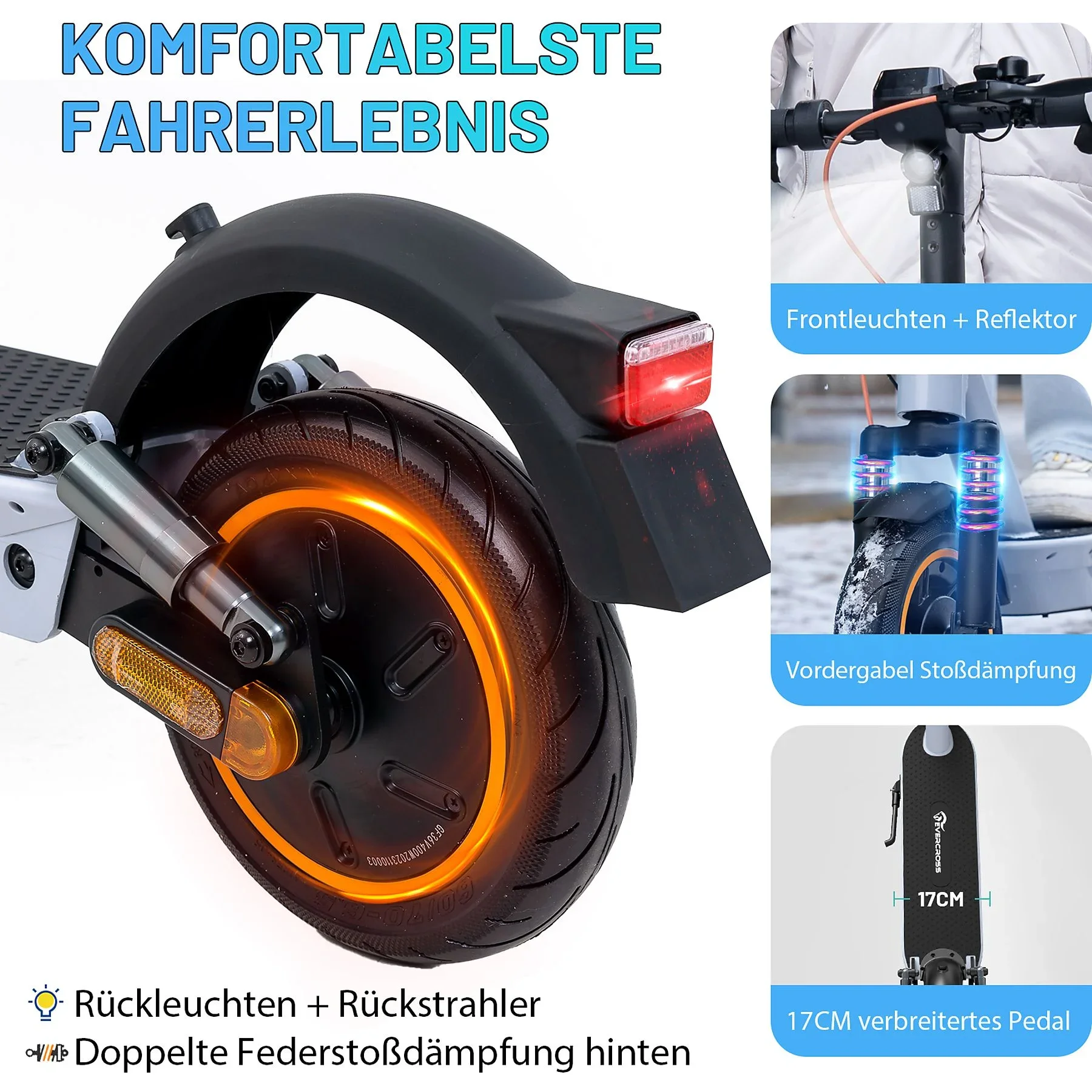 Highlights: Faltbares Design, sichere Nicht-Null-Startfunktion, App-Steuerung über EVERCROSS PRO, verstärkte Vorderradfederung, intelligentes Batteriemanagementsystem (BMS) mit mehreren Schutzfunktionen.