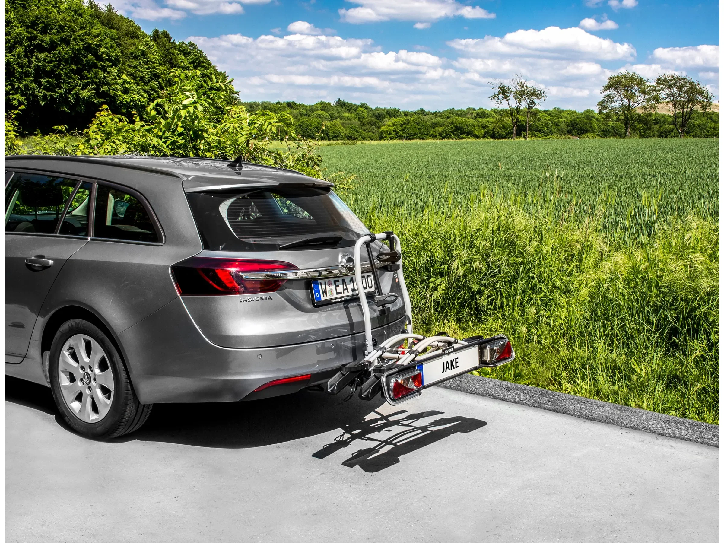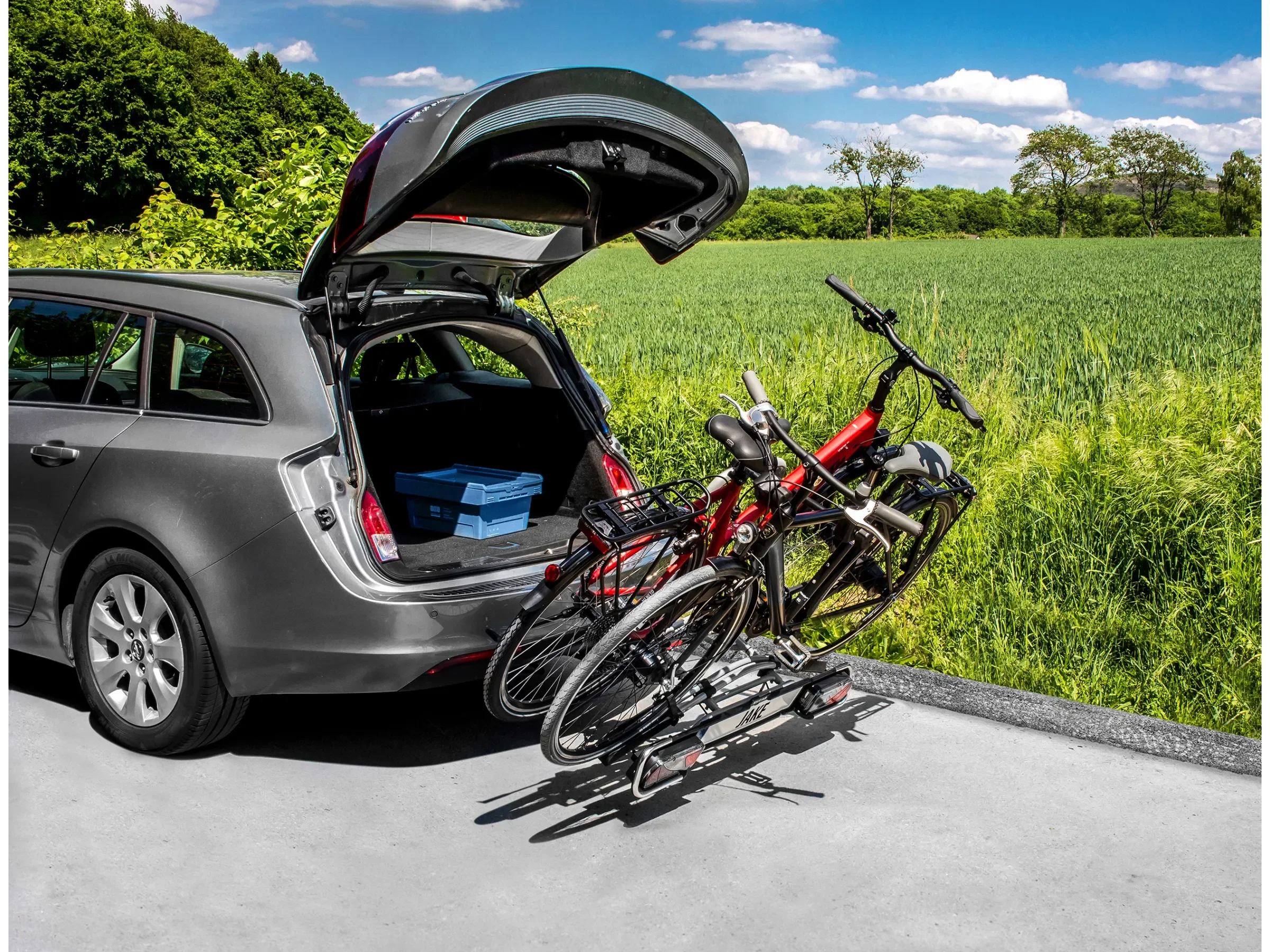 Durch den praktischen Abklappmechanismus bleibt der Zugang zum Kofferraum in beladenem Zustand möglich. Der Träger ist nahezu vormontiert und kann optional auf drei Fahrräder erweitert werden.