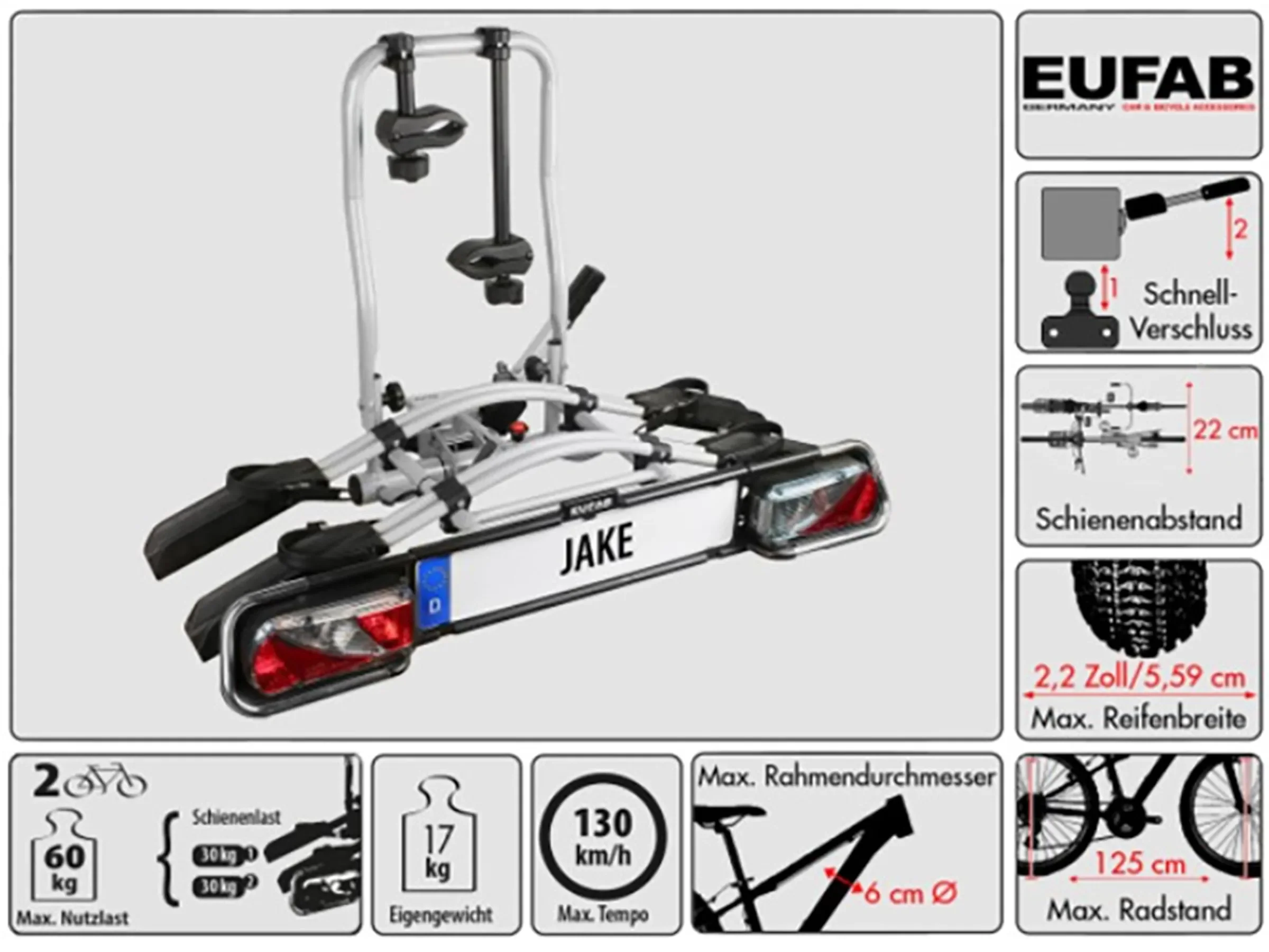 Der Jake Kupplungsträger von Eufab eignet sich ideal für den Transport von zwei Fahrrädern und ist dank hoher Schienenlast auch für E-Bikes und große Bikes ausgelegt. Die robusten Doppelrohr-Stahlschienen sorgen für sicheren Stand, während abschließbare Rahmenhalter und Schnellverschluss für hohen Komfort und Schutz vor Diebstahl sorgen.