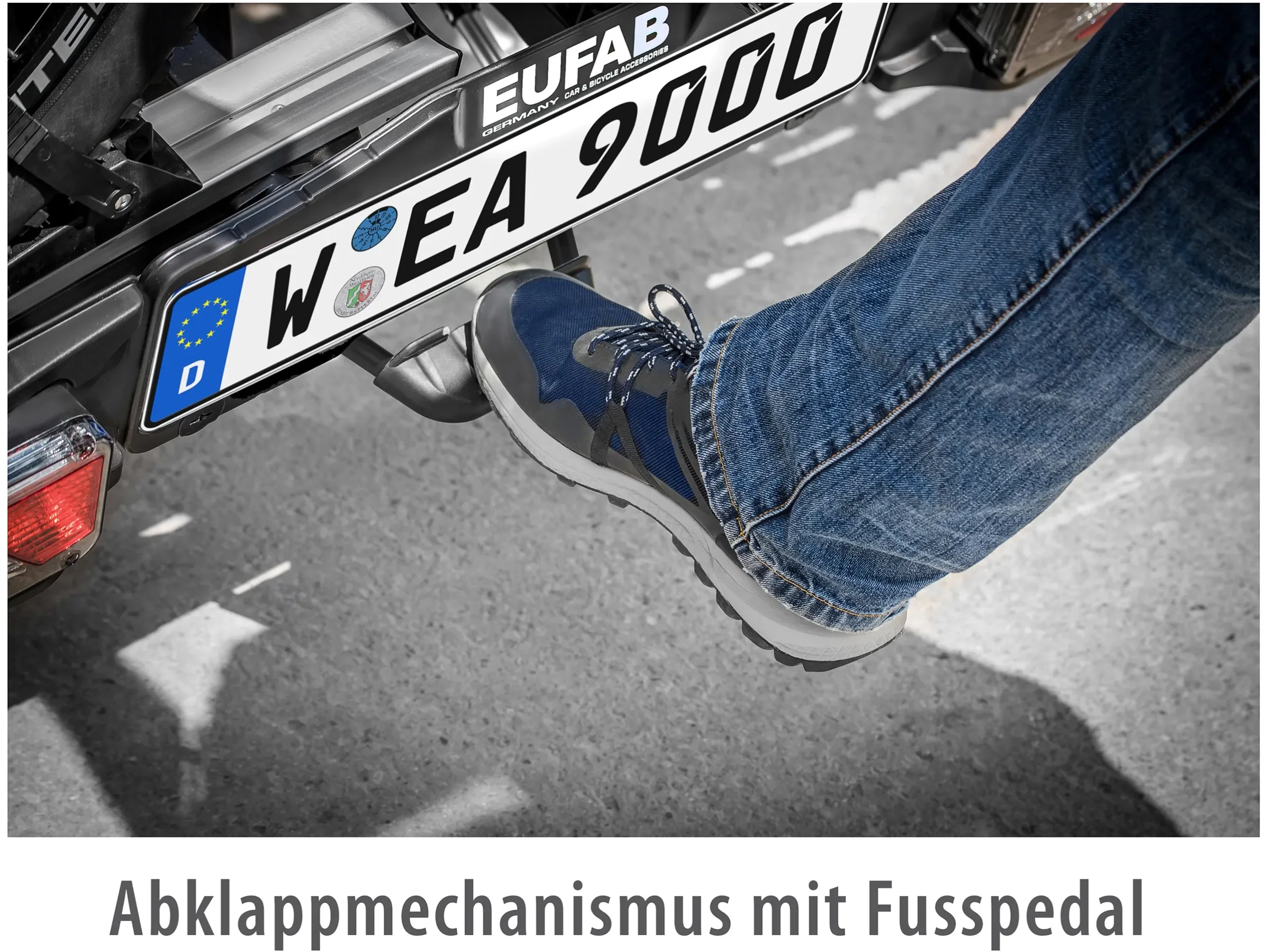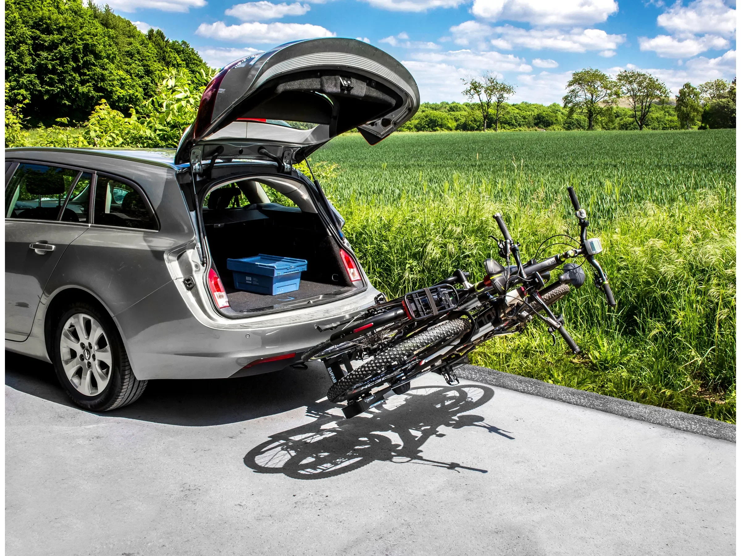 Der integrierte Abklappmechanismus erlaubt jederzeit den Zugang zum Kofferraum – auch mit geladenen Rädern. Die abschließbaren Rahmenhalter und der abschließbare Träger sorgen für hohe Sicherheit.