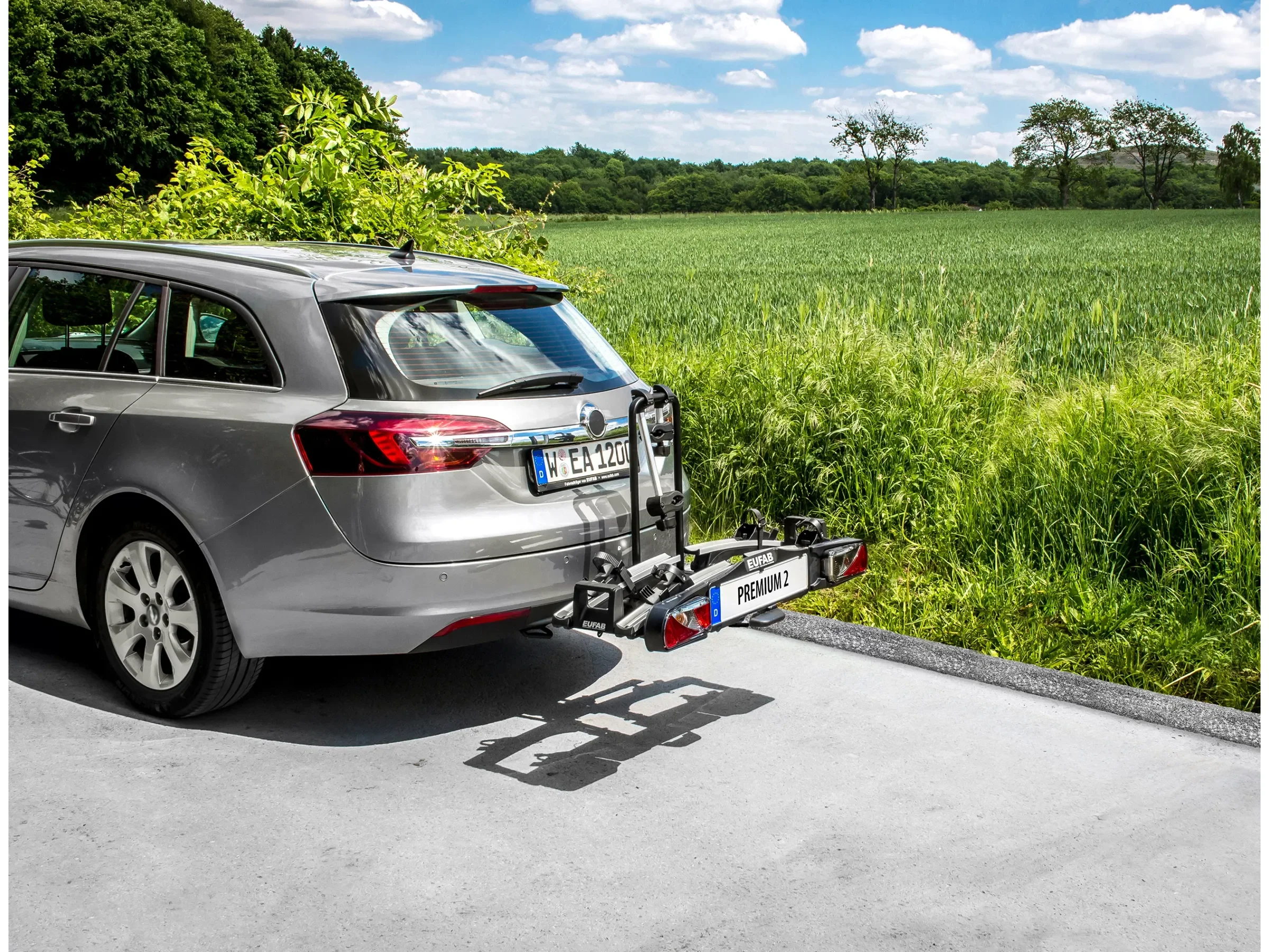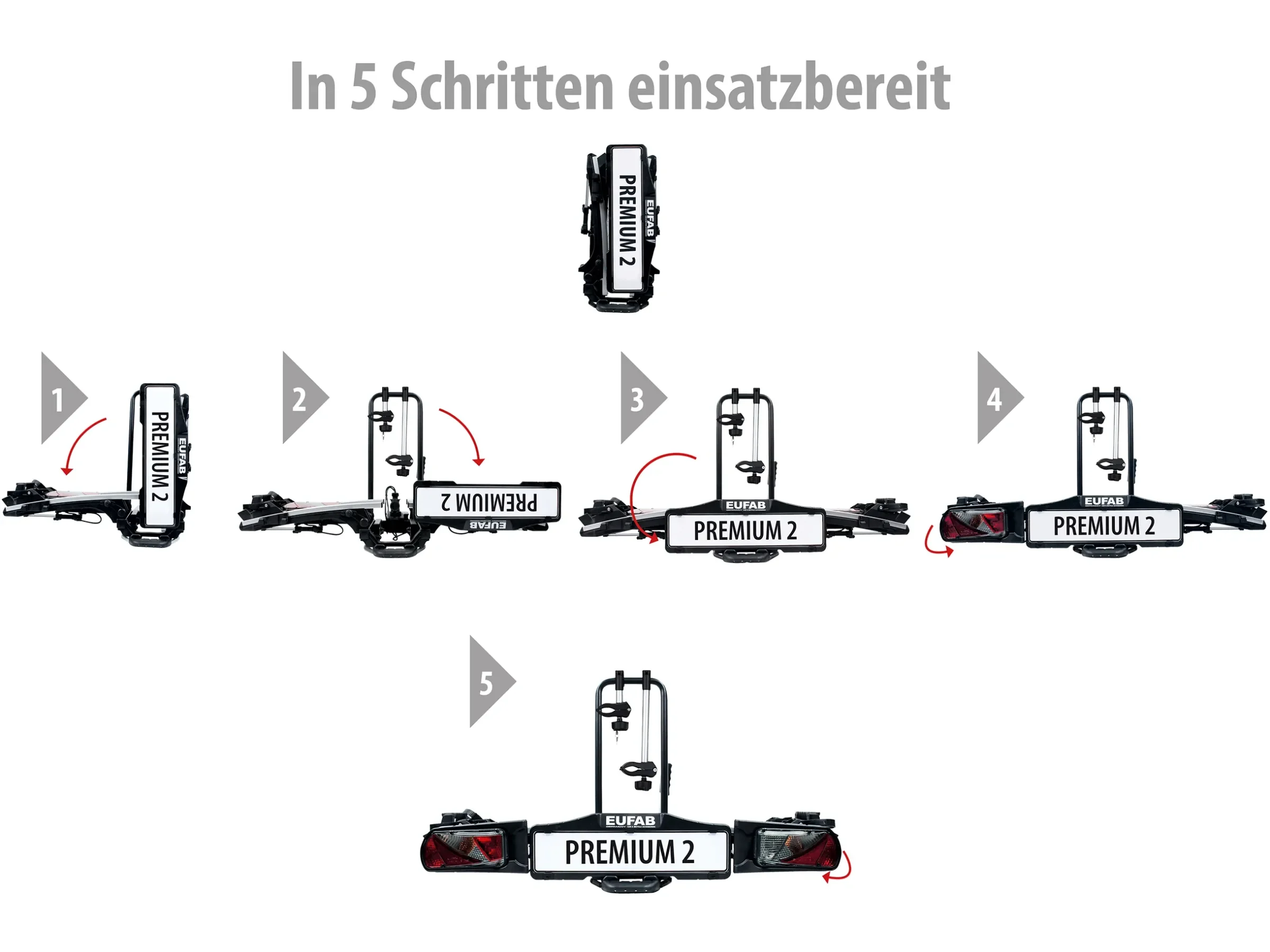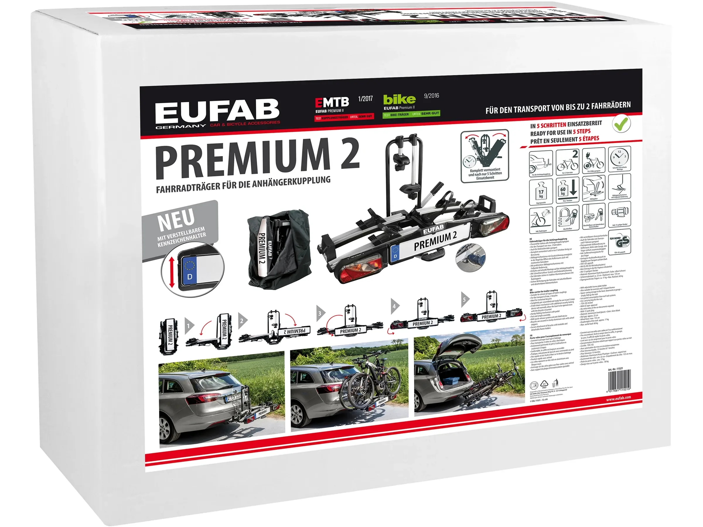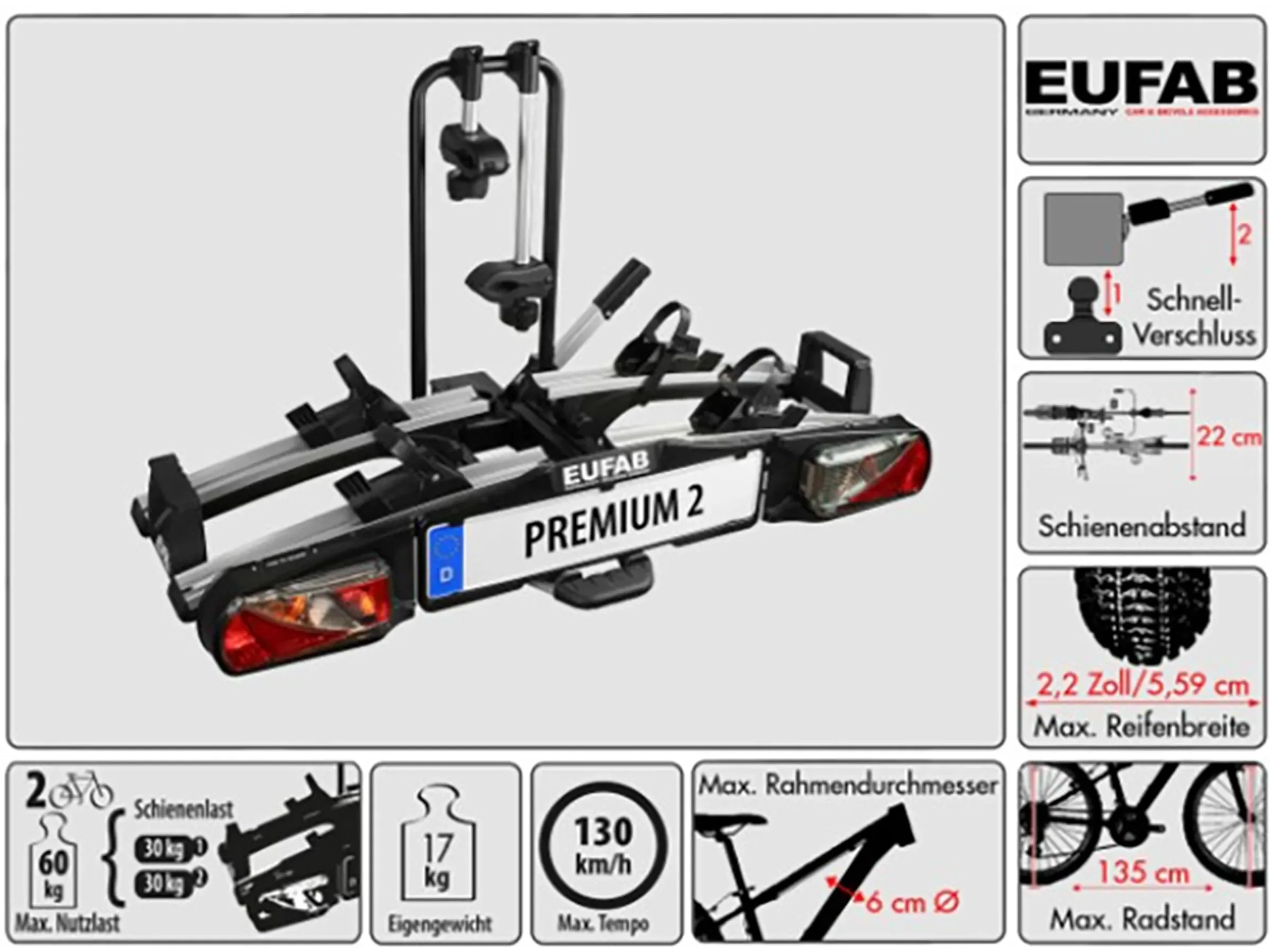 Der Eufab Premium 2 ist ein komfortabler, stabiler Kupplungsträger für zwei Fahrräder und ideal für den Transport von E-Bikes geeignet. Dank niedriger Ladehöhe ist das Aufsetzen der Räder besonders bequem. Der Träger lässt sich in wenigen Schritten montieren, sicher fixieren und für die platzsparende Lagerung zusammenfalten.