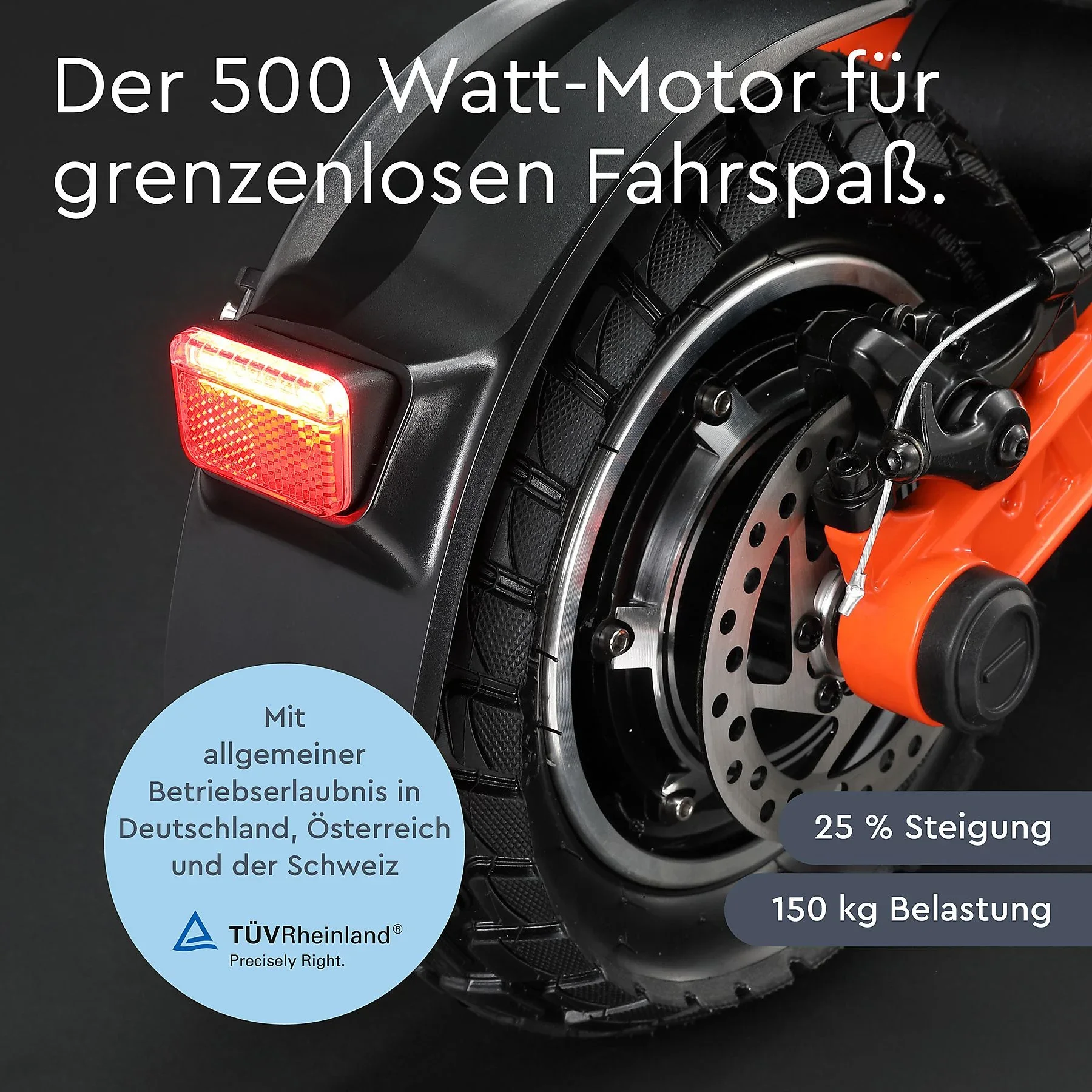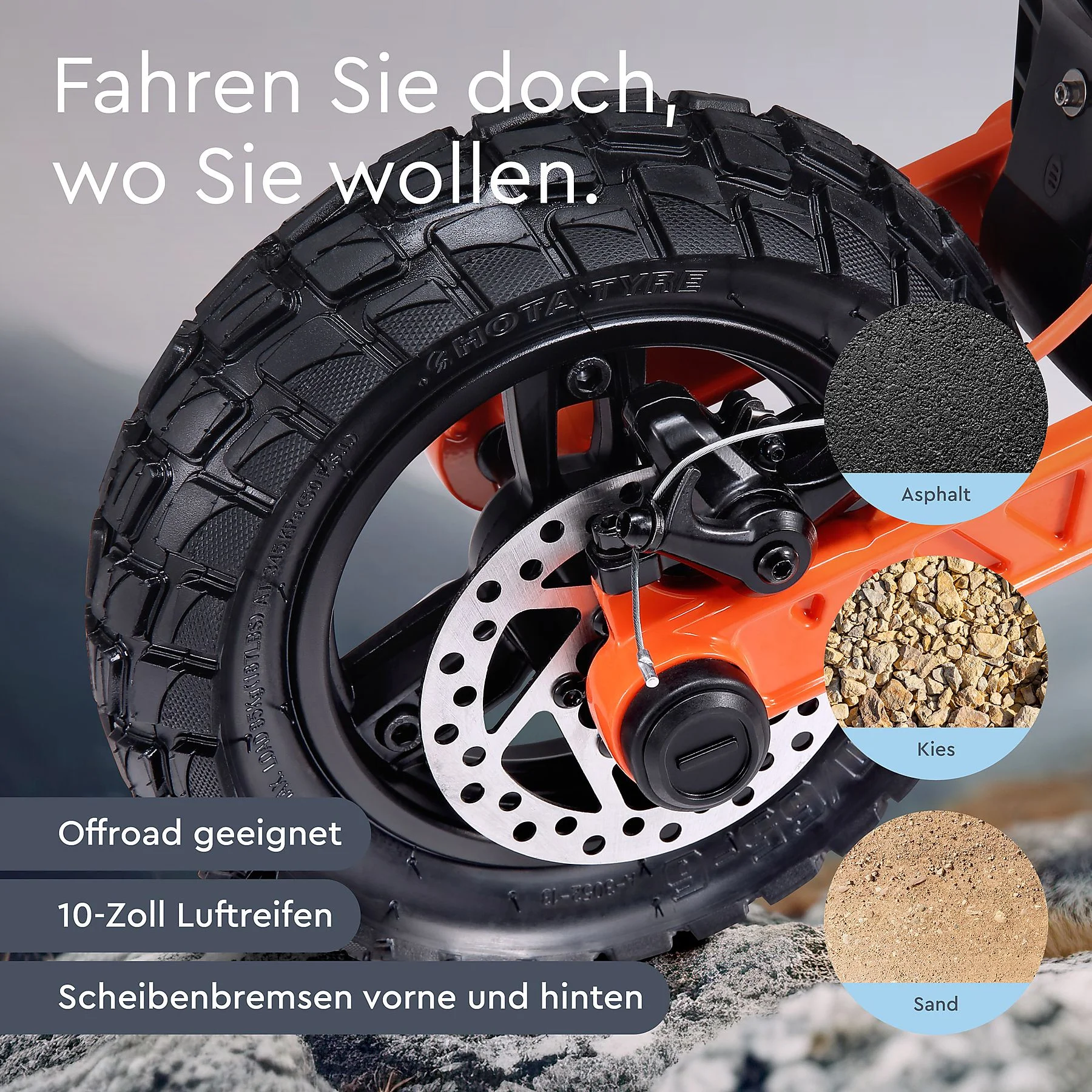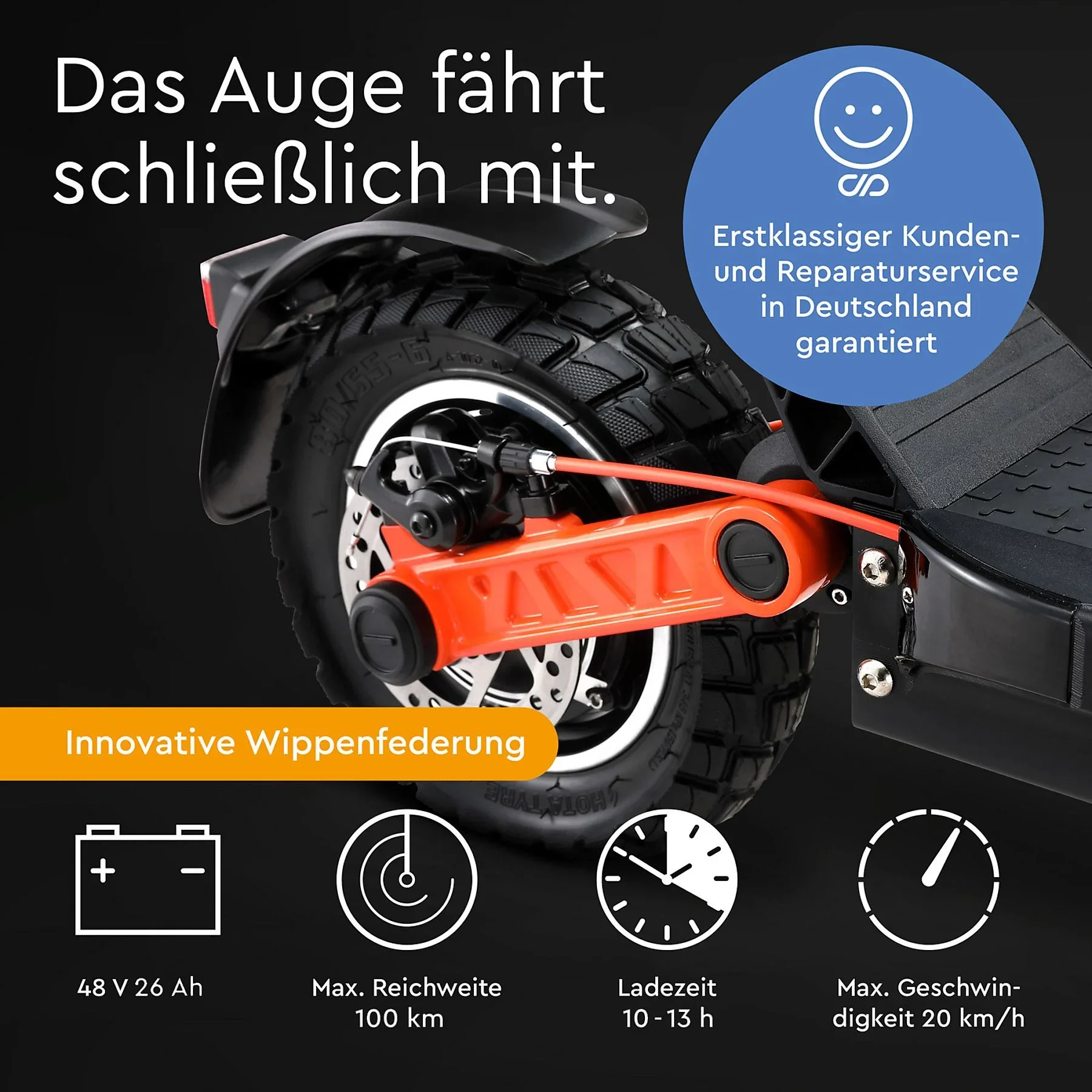 Der kraftvolle 500-Watt-Motor in Verbindung mit einem leistungsstarken 48-V-Akku mit 26 Ah ermöglicht Reichweiten von bis zu 100 km. Dank der einzigartigen Wippenfederung vorne und hinten sowie 10-Zoll-Offroad-Luftreifen bleibt das Fahrgefühl auch auf unebenem Untergrund komfortabel und kontrolliert.