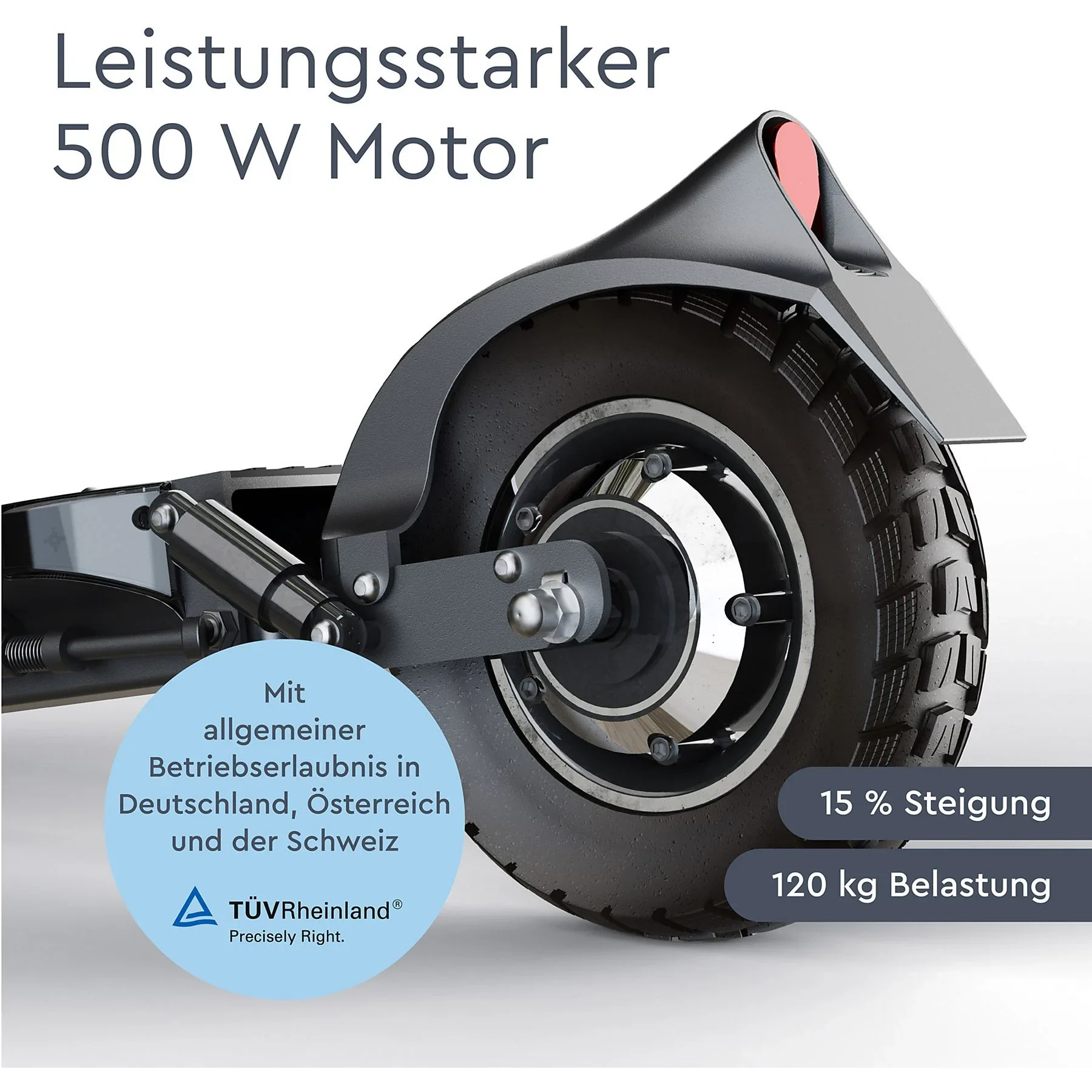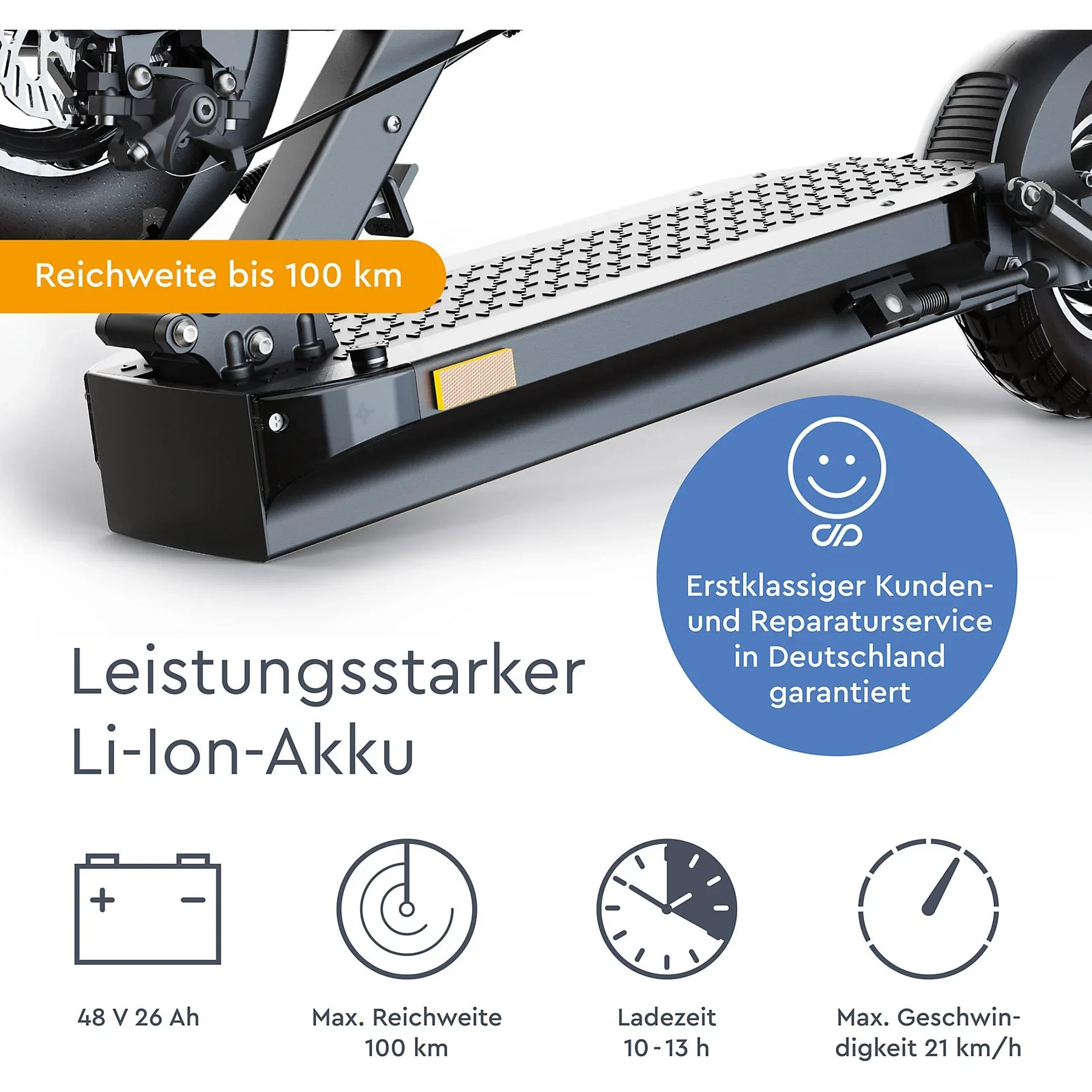 Highlights: Straßenzulassung (ABE), sehr hohe Reichweite, doppelte Federung vorne und hinten, Scheibenbremsen an beiden Rädern, USB-Ladeanschluss für mobile Geräte.