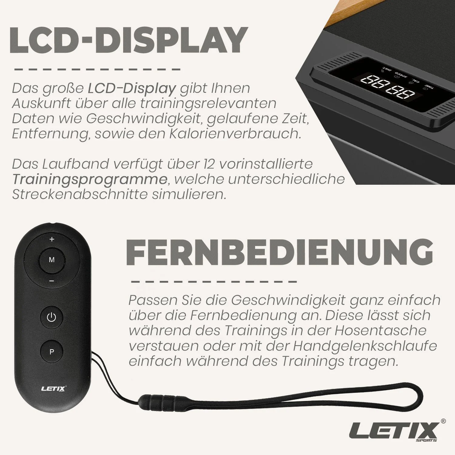 12 vorinstallierte Programme variieren Geschwindigkeit und Streckenabschnitte. Die Bedienung erfolgt komfortabel über eine Fernbedienung, während das LCD-Display Daten wie Zeit, Distanz, Kalorien und Geschwindigkeit anzeigt. Transportrollen erleichtern das Verschieben.