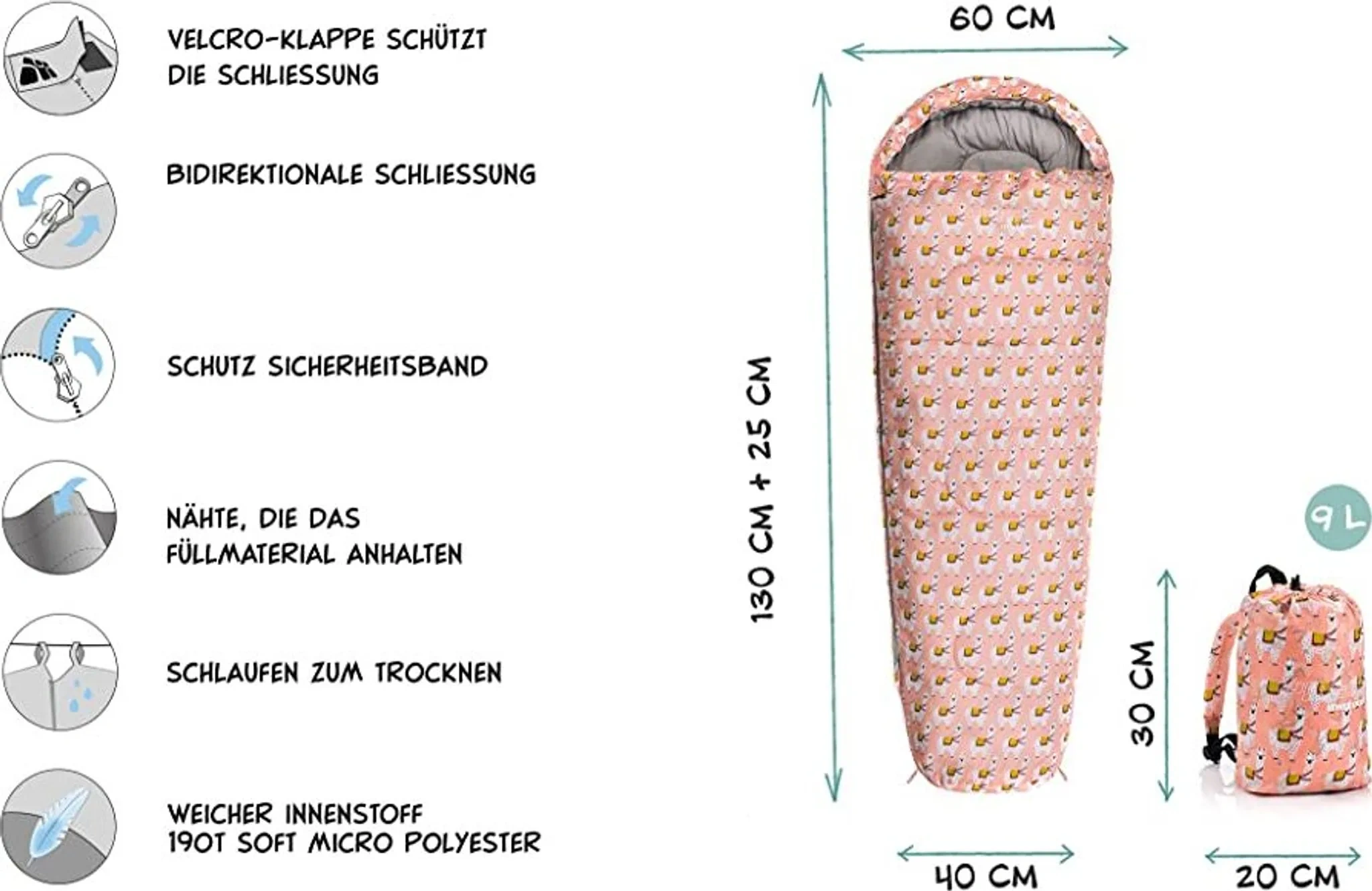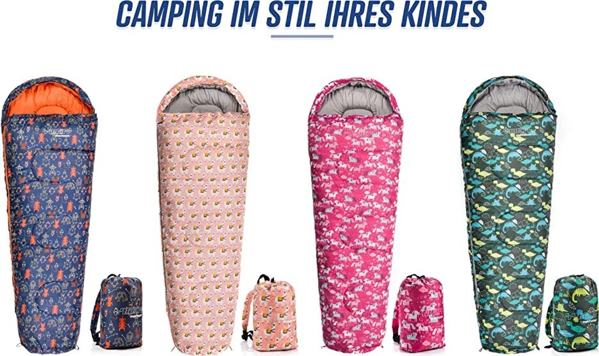 Highlights: Leicht & kompakt, hochwertige Isolierung, weiches Innenfutter, farbenfrohes Kindermotiv, inklusive Tragerucksack, ideal für Camping, Hütten oder Jugendfreizeiten.