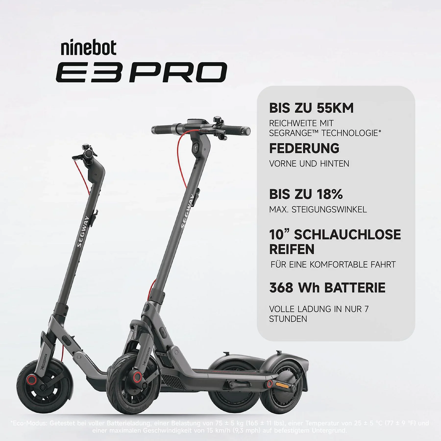 | Max. Reichweite | Bis 55 km (Eco), bis 47 km (Sport) |