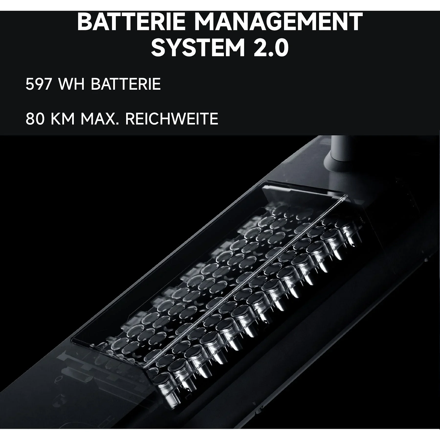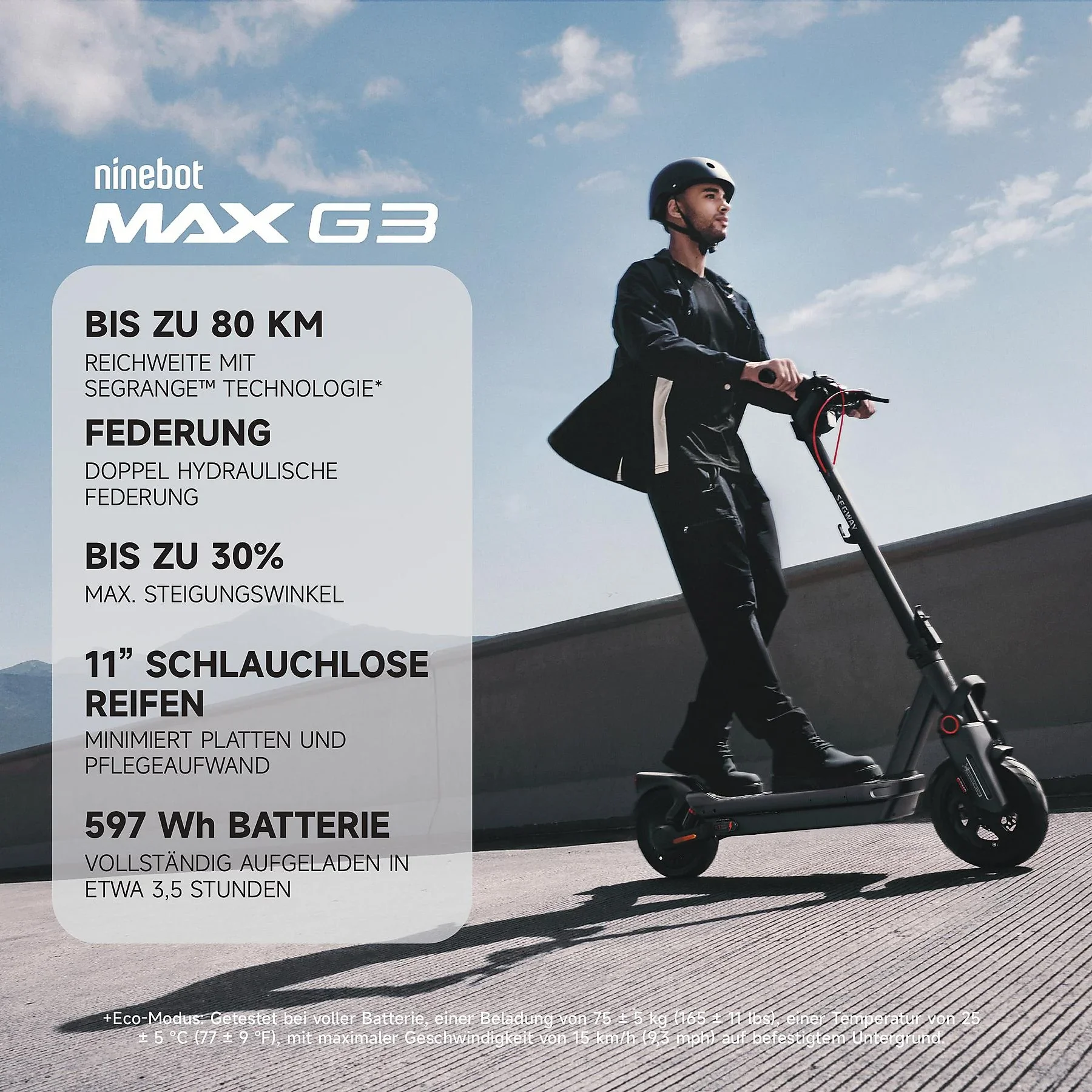 | Max. Reichweite | Bis 80 km (Eco-Modus), bis 75 km bei 20 km/h |