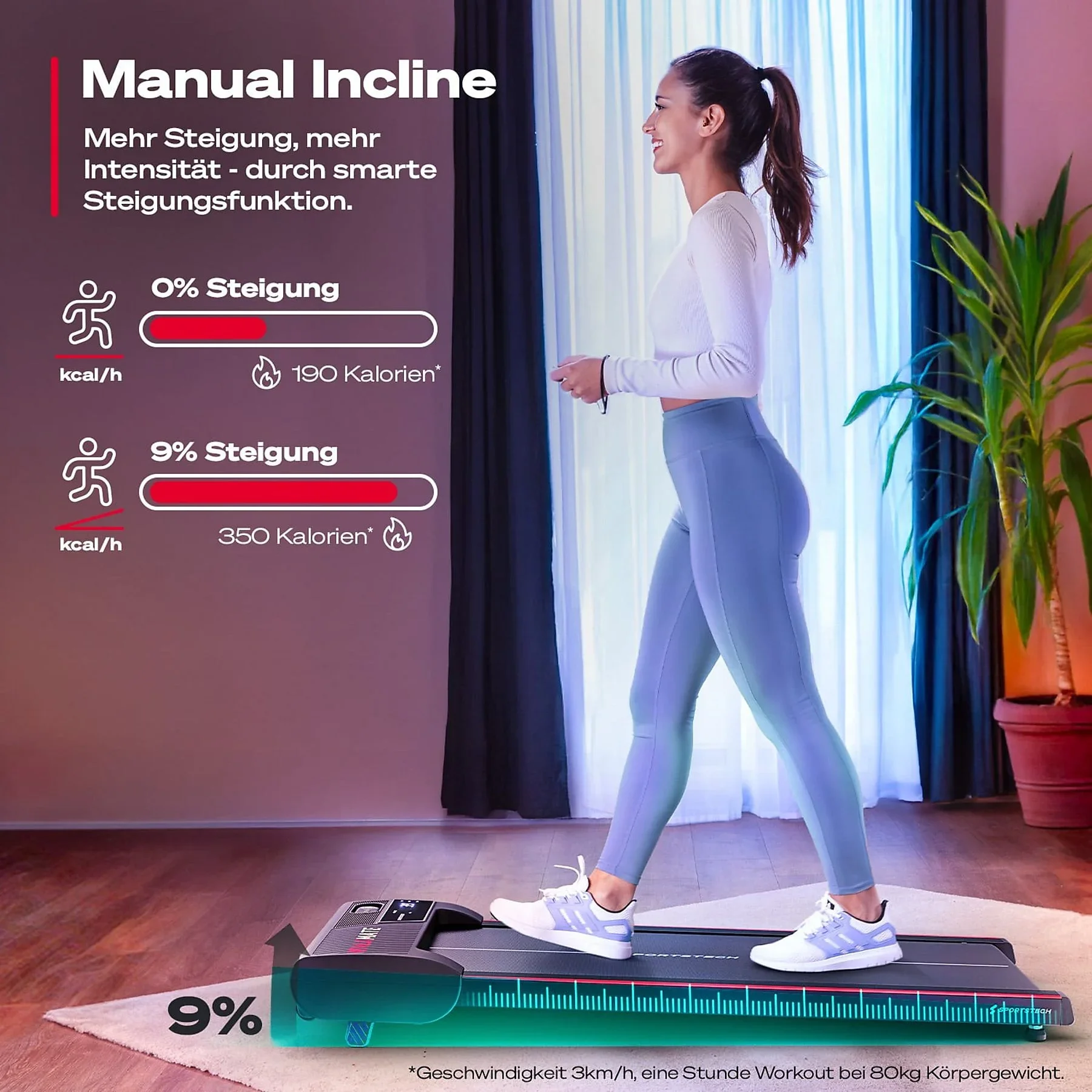 Highlights: ultraflach, 6 km/h, 9 % Steigung, Schrittzähler, 4 Programme, App-Workouts, leiser Betrieb, 120 kg, sehr leicht, ideal für aktive Pausen & Home-Office.