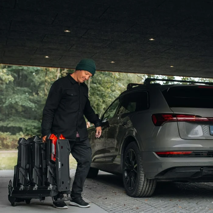 Per Fußpedal lässt sich der Träger samt Rädern abklappen, um jederzeit Zugriff auf den Kofferraum zu behalten. Zusammengefaltet reduziert sich der Platzbedarf deutlich, was Lagerung und Transport erleichtert. Dank integrierter Transporträder und Tragegriff bleibt der Umgang besonders komfortabel.
