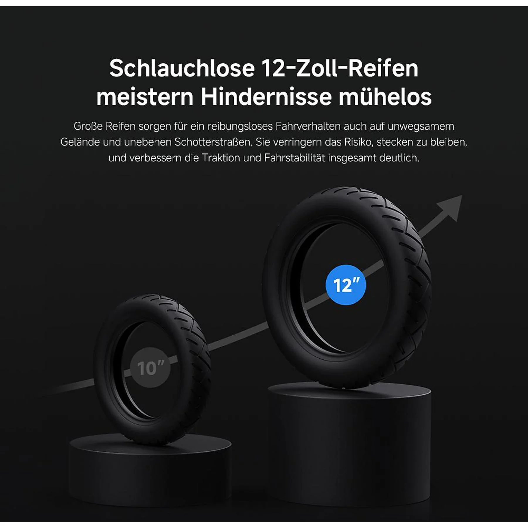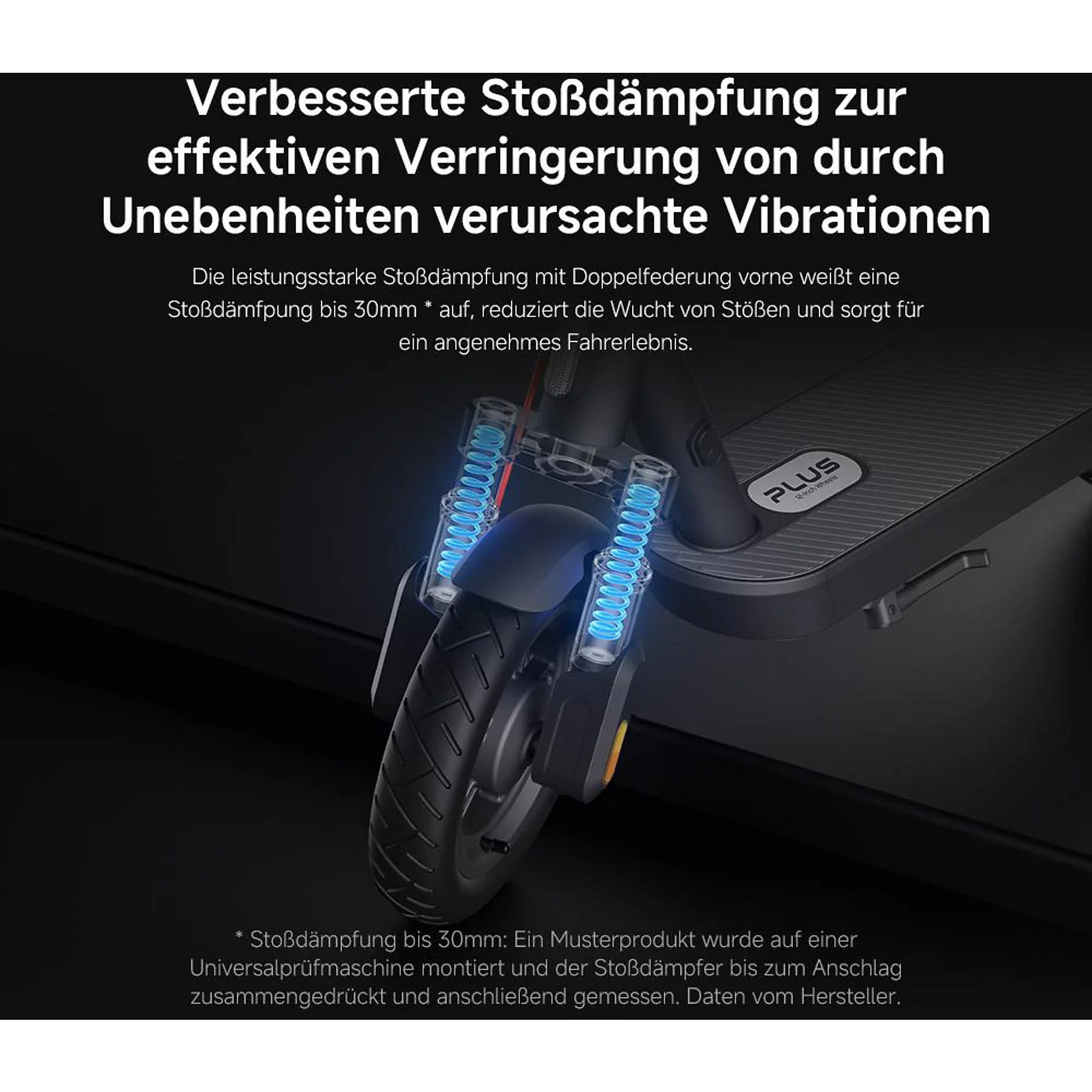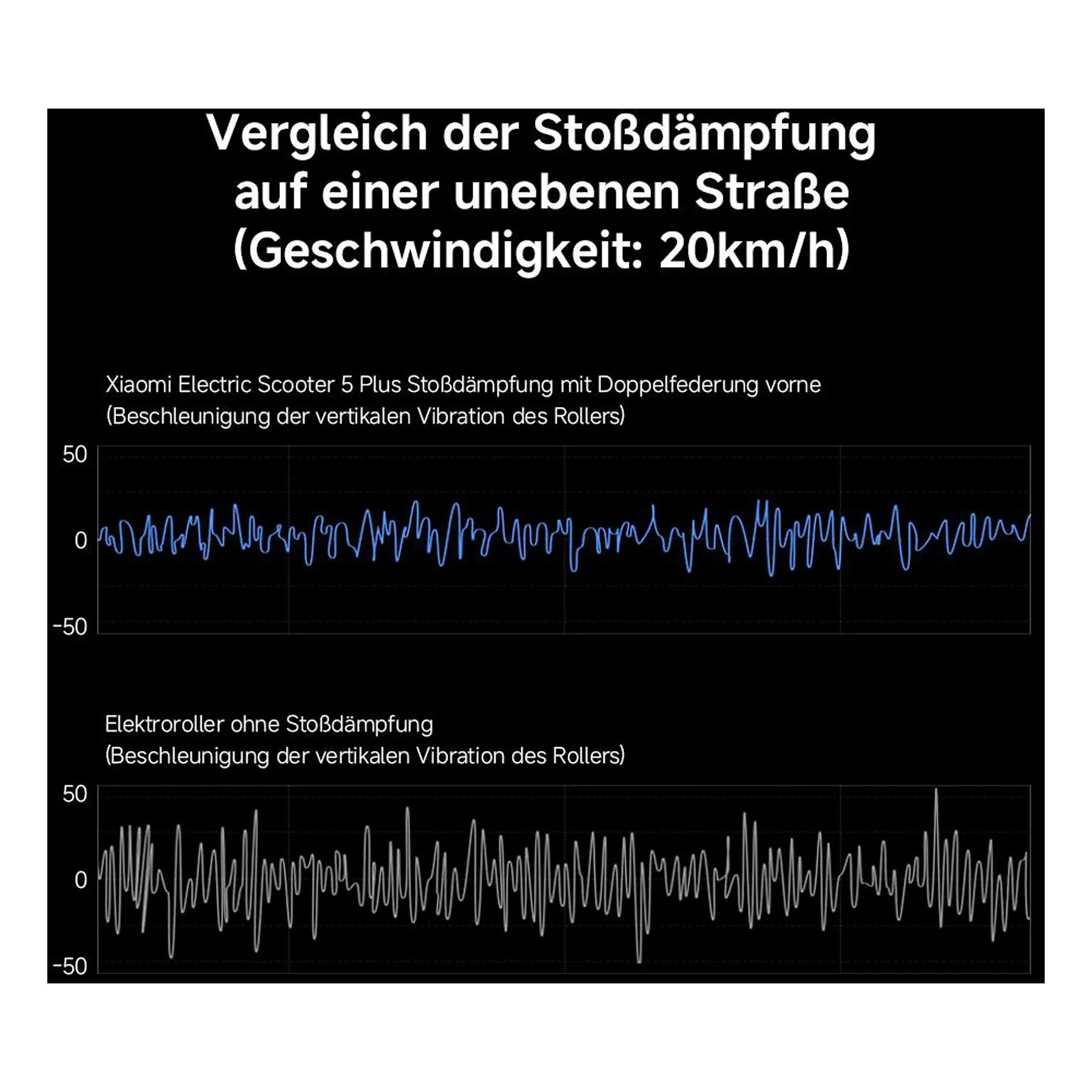 Der Xiaomi Electric Scooter 5 Plus wurde für anspruchsvolle Stadt- und Pendelstrecken entwickelt. Große 12-Zoll-Schlauchlosreifen und eine doppelte Vorderradfederung mit ca. 30 mm Federweg sorgen für ein ruhiges, komfortables Fahrgefühl – selbst auf unebenen Wegen oder Schotter.