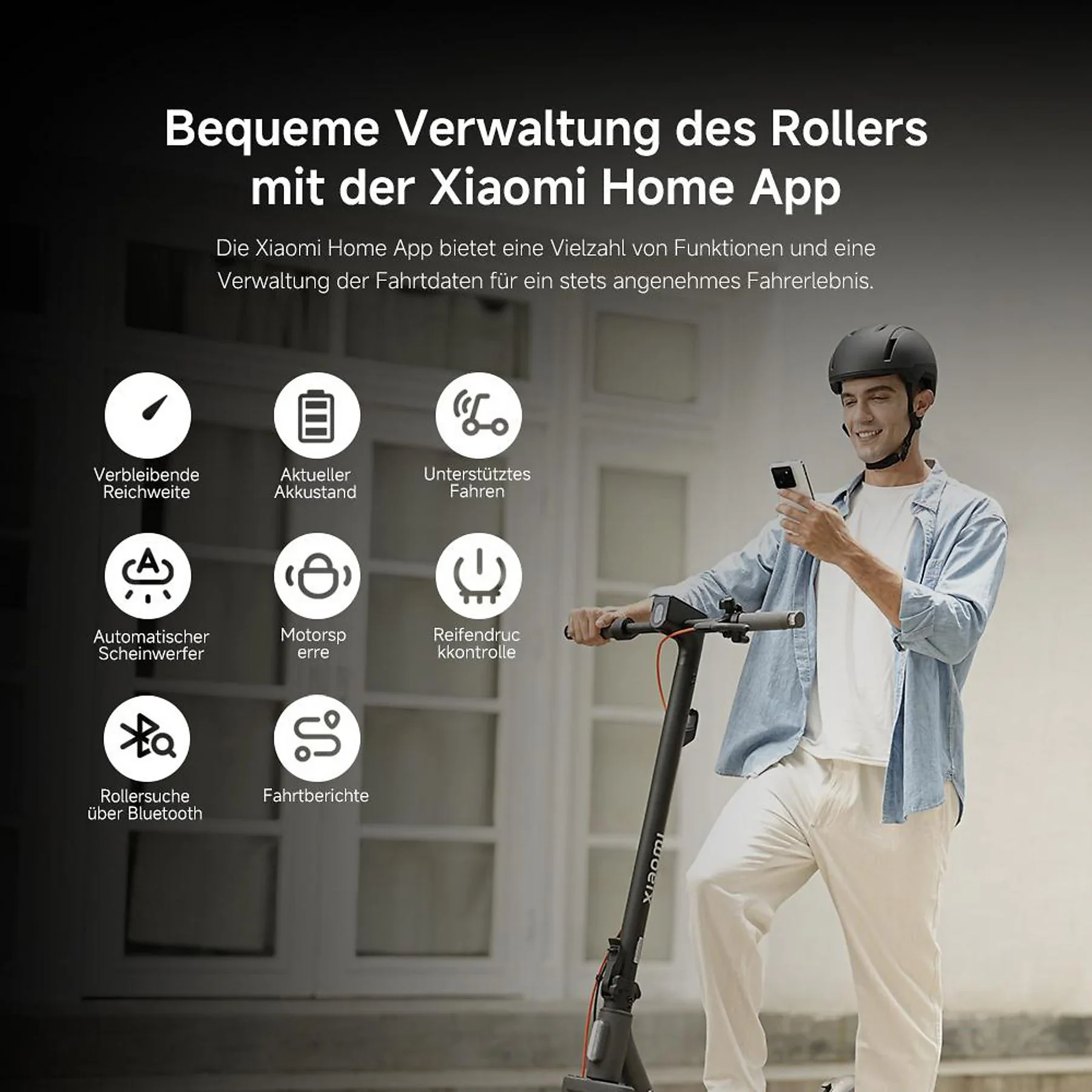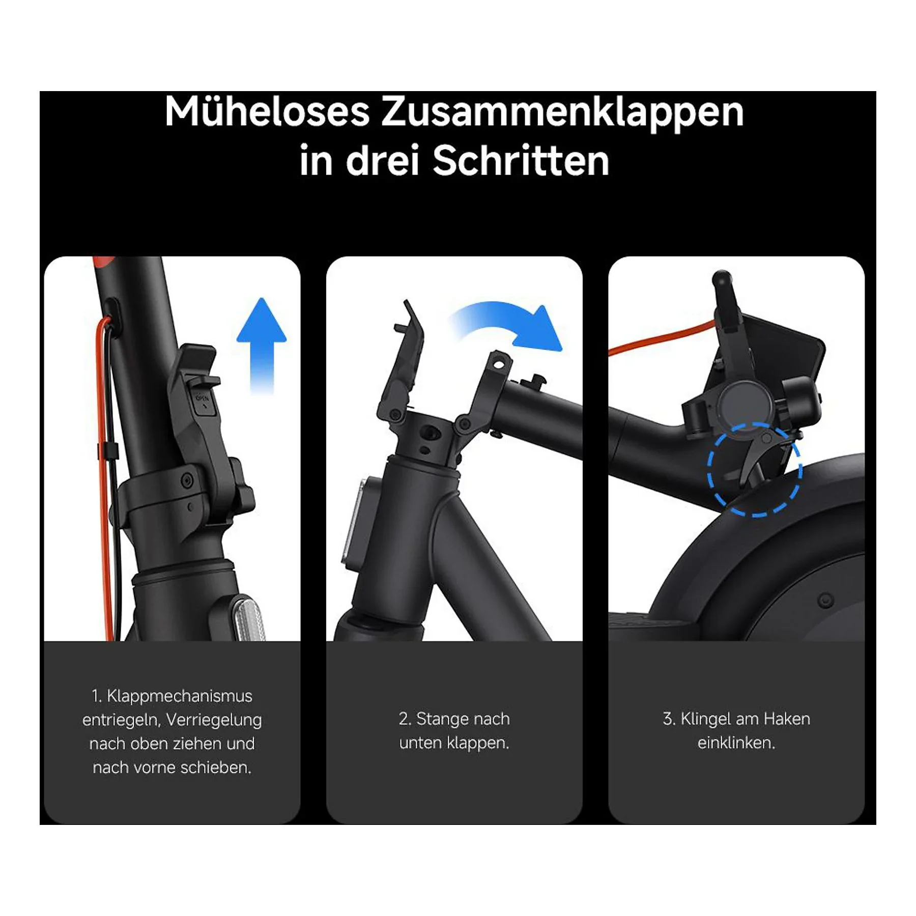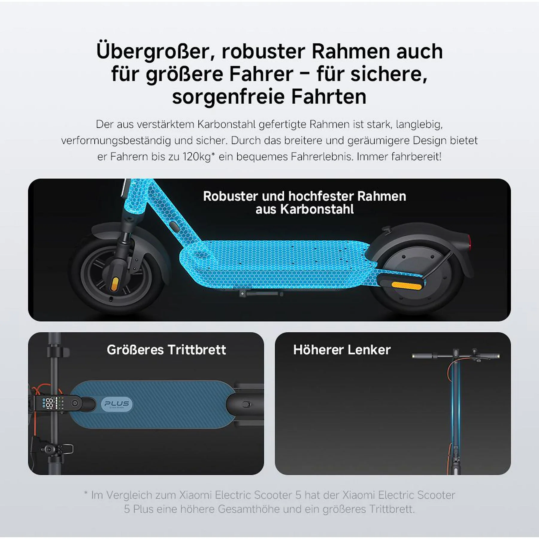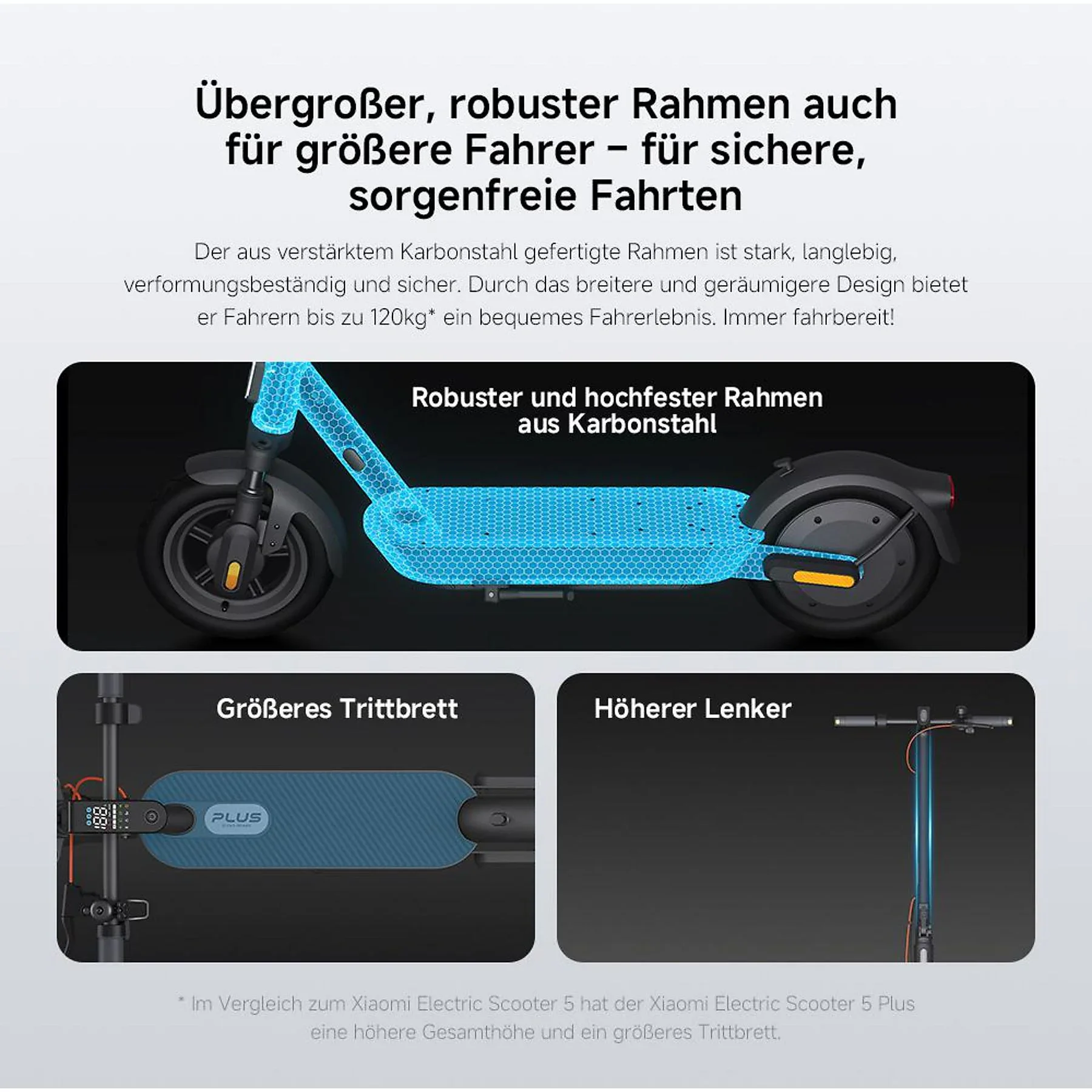 | Im Paket | Xiaomi Electric Scooter 5 Plus, Ladegerät, T-förmiger Inbusschlüssel, Haken, Schrauben, technische Daten, Bedienungsanleitung |