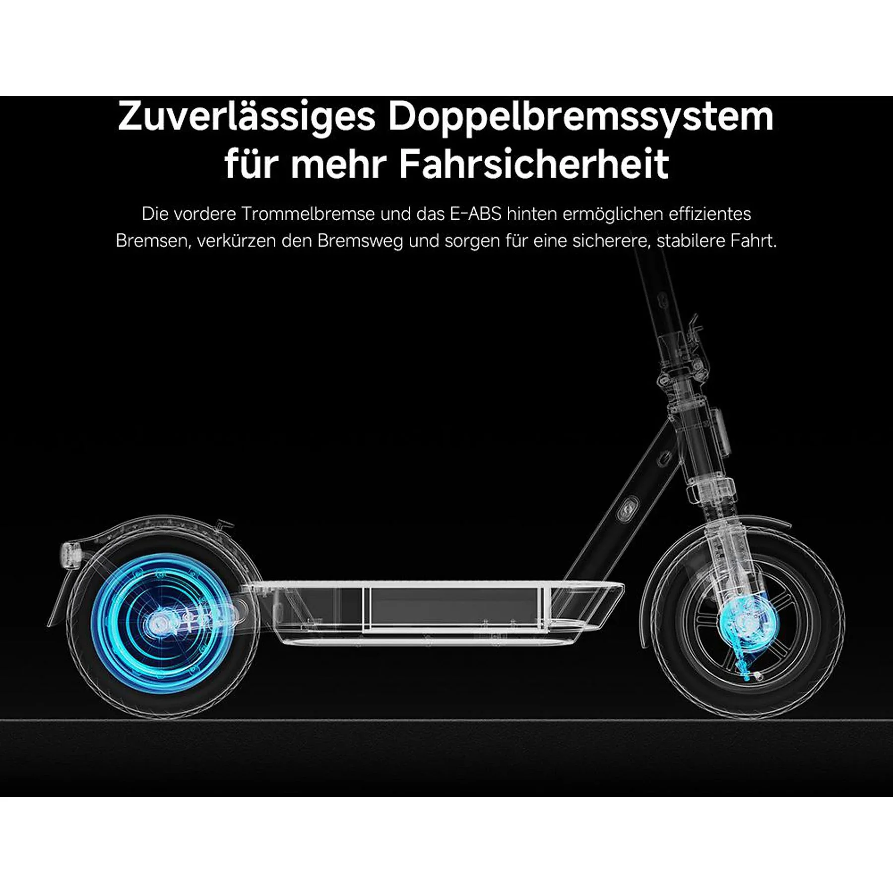 Highlights: Große 12-Zoll-Reifen für mehr Stabilität, doppelte Vorderradfederung, Smart-TCS-Anti-Rutsch-System, intelligentes BMS mit mehreren Schutzmechanismen, robuster Rahmen aus verstärktem Kohlenstoffstahl.